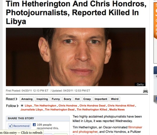 Initial reports were that Hetherington and photographer Chris Hondros were both killed—but the Times and others are now reporting that Hondros and photographer Guy Martin are in grave condition rather than dead.
