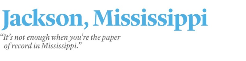 Jackson is the capital of Mississippi; the Clarion Ledger is the state’s largest daily newspaper, with a circulation of 57,700. Readership has fallen over the past 20 years as the recession, combined with losses in advertising revenue as companies go digital, has whittled away the paper’s size. Ten years ago, the newsroom held around 50 staffers; today, only 32 editors and reporters are left to report on the community.