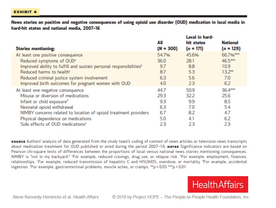 Why local news played up negative consequences more often than national news was beyond the scope of the study. “It may be that certain issues like diversion of these medications are more likely to appear in local newspapers covering local crime,” Kennedy-Hendricks says. “Or that NIMBY issues related to medication treatment providers are more likely to appear in local news stories.”