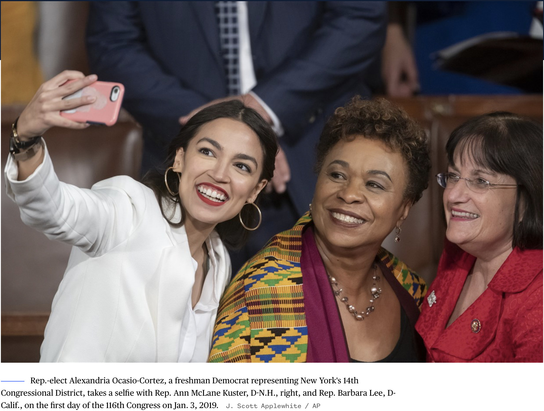 As much as she stands out or is accused of seeking the limelight, however, Ocasio-Cortez has proved as content being one of many. That’s especially true being part of the wave of Democratic women elected to Congress in the 2018 midterm election. This photo, of Ocasio-Cortez taking a selfie with her new colleagues, was made by AP’s J. Scott Applewhite on the first day of her first session.