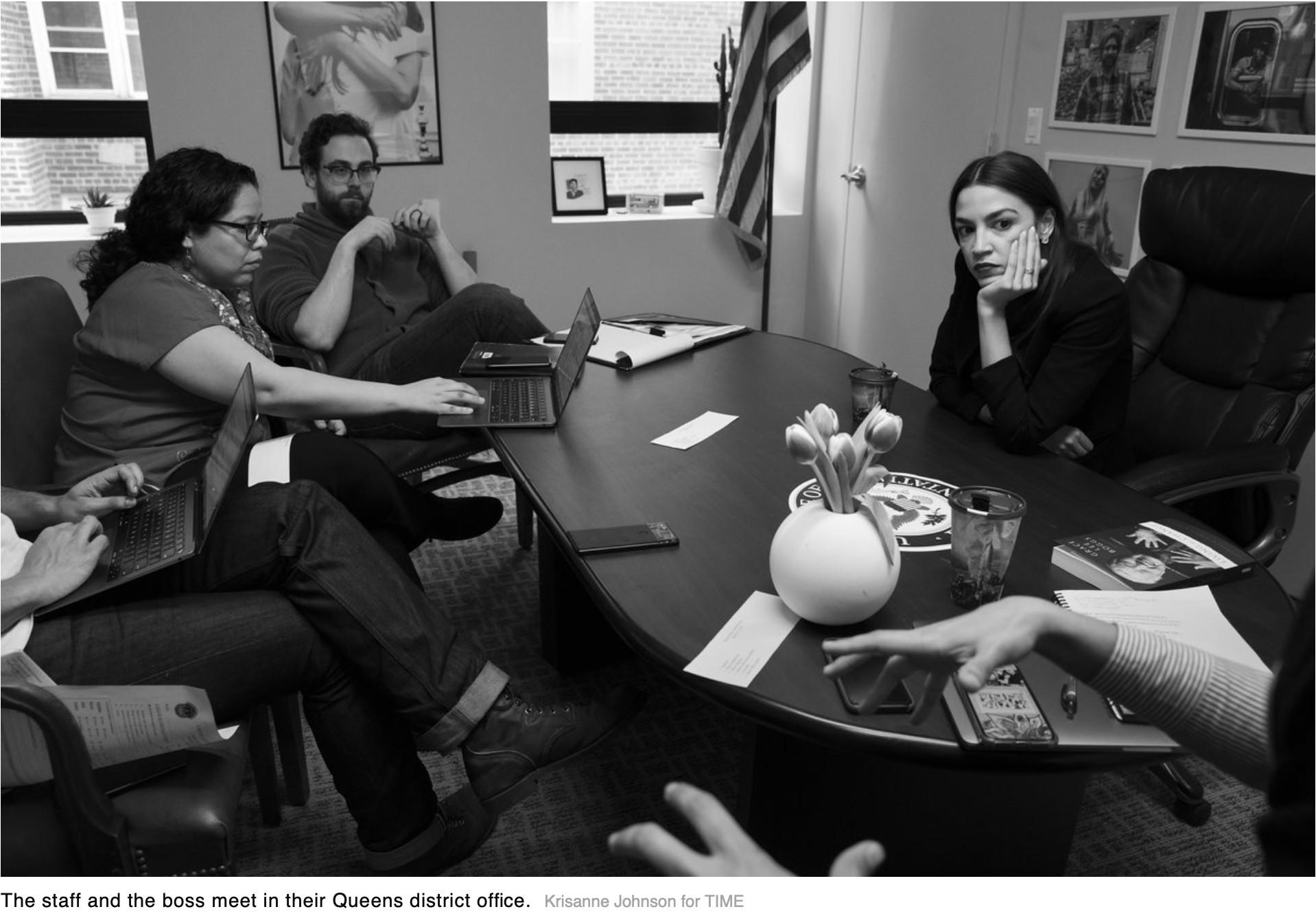 Reflecting Ocasio-Cortez’s passion for service, the photo above by Krisanne Johnson, a New York photographer, is the culmination of many impassioned photographs with constituents posted during Ocasio-Cortez’s campaign. It’s a shot of the congresswoman with her staff in her district office in Jackson Heights.