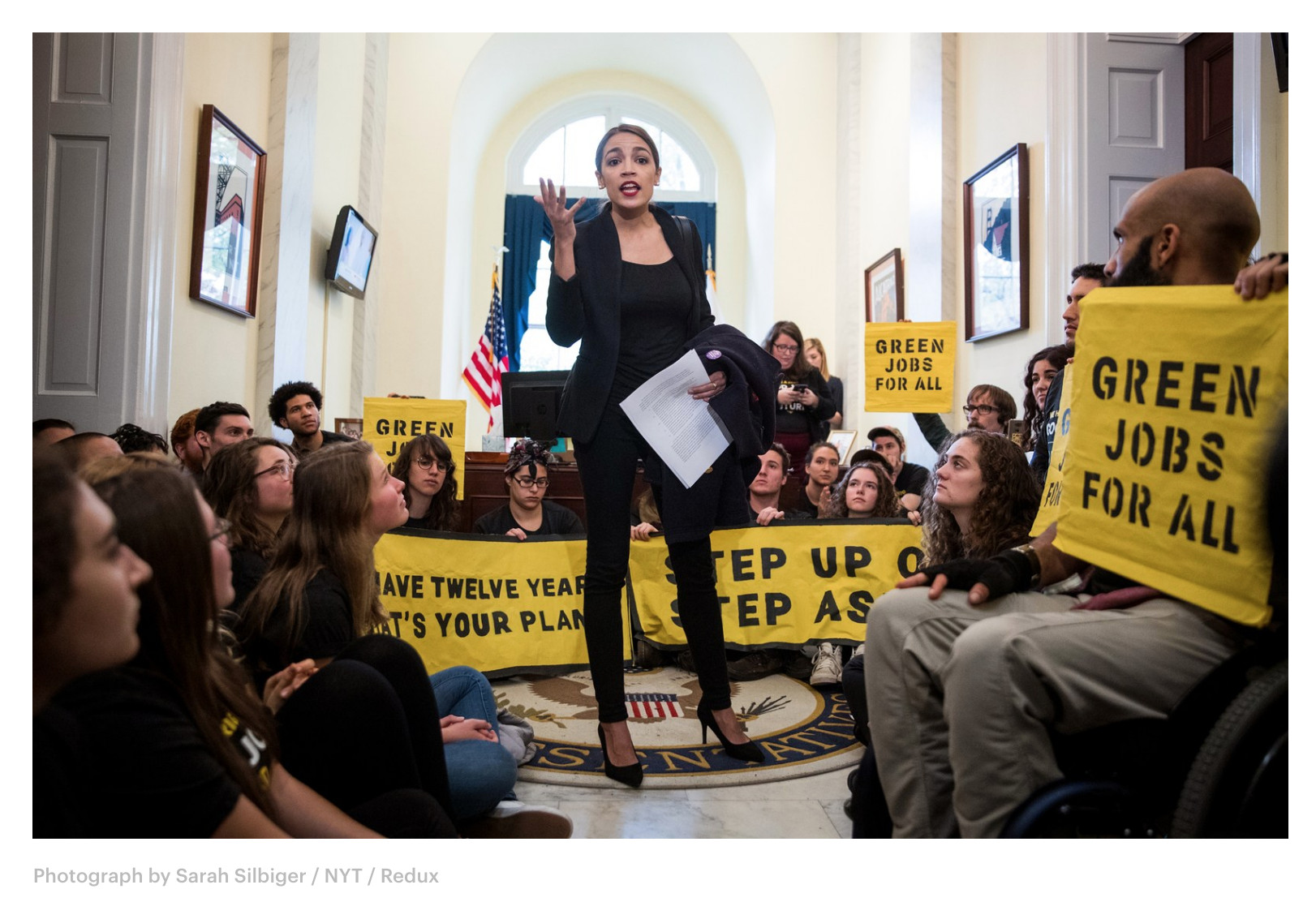 Ocasio-Cortez certainly fed that perception in her early days on the Hill, most visibly by joining a group of students holding a sit-in in House Speaker Nancy Pelosi’s office in support of the Green New Deal. This shot, taken by Sarah Silbiger for the Times, was also widely covered by the photo press. In challenging Pelosi, Ocasio-Cortez established herself as a champion of the initiative, as well as a force to be reckoned with, visual and otherwise.