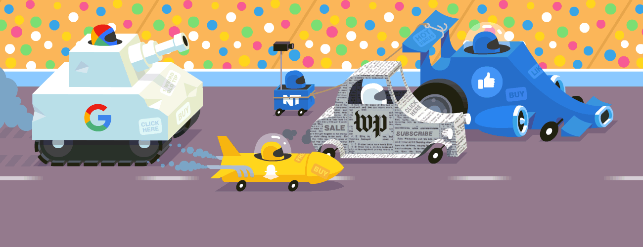 How to possibly make sense of it all? By thinking of it as a race, as we did, for position and power. These graphics let you sit behind the wheel with some of the industry’s top racecar drivers, from Facebook to The Washington Post, as they vie for position on the track. Hopefully, you’ll get a sharper fix on the players, the tensions, and the reordered world we all now inhabit.