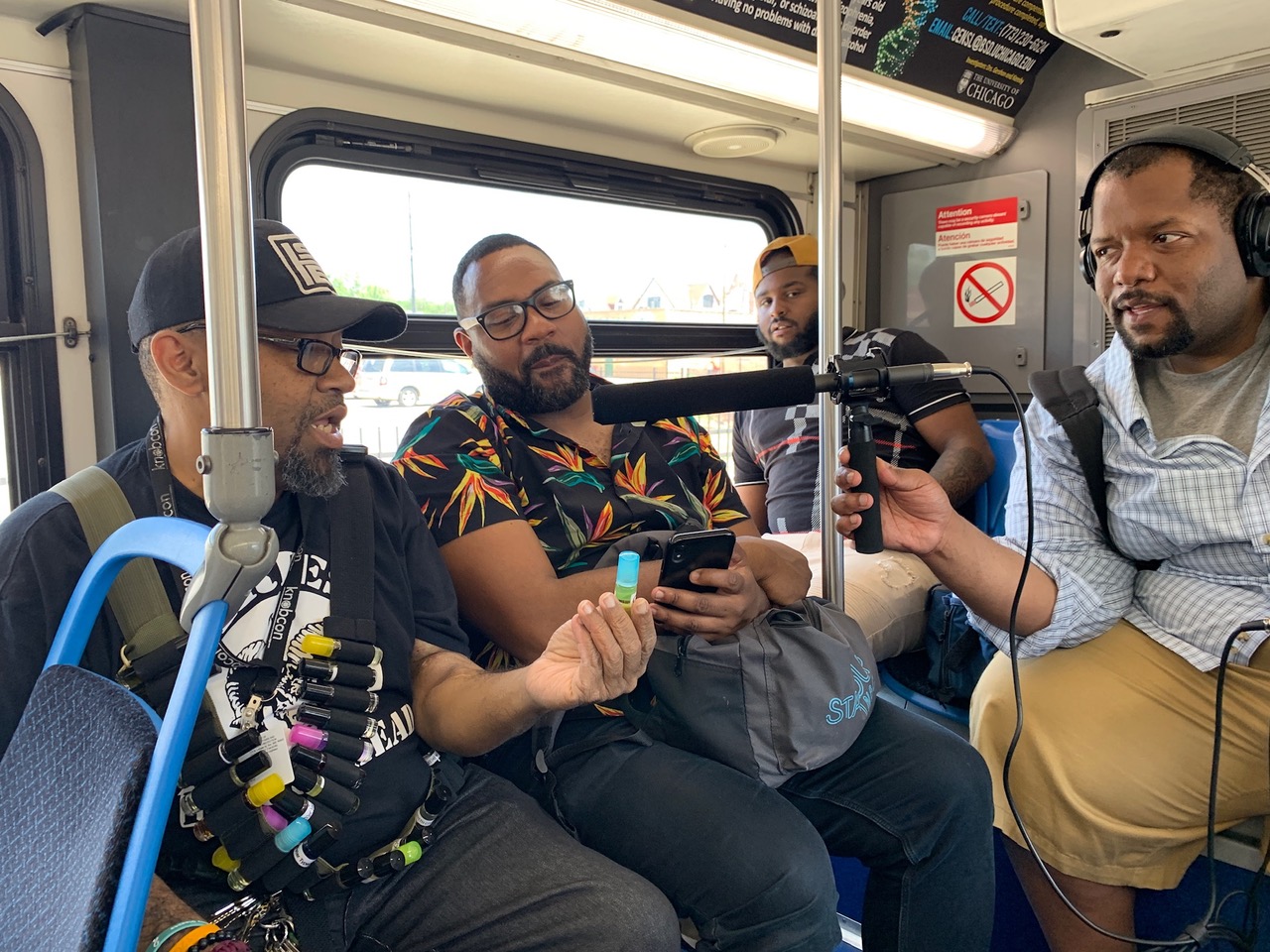 WBEZ Producer James Edwards (right) interviews (from left) Dave Helem and James “The Oil Man” Redmond for the South Side Stories podcast. Bia Medious/WBEZ.