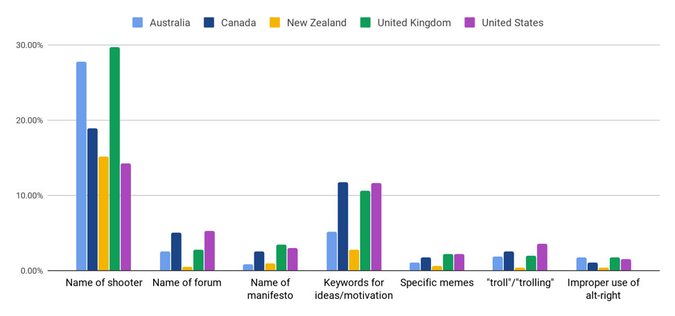 While UK media appears especially willing to share the shooter’s name, US and Canadian media were especially likely to discuss the shooter’s ideology and motivations. We found that 106 US stories on the massacre (representing 5.3 percent of the stories we retrieved) mention the forum where the killer shared his ideas, and 231 US stories (11.6 percent) discuss specific ideas and conspiracy theories shared in his manifesto. Five percent of Canadian stories mention the forum, and 11.7 percent mention specific phrases in the manifesto. Several US publications sought to explain references to internet culture in the gunman’s writings. Many of these pieces were insightful—The New York Times’s Kevin Roose, for example, wrote a thoughtful analysis of the ways in which the killings seemed a particularly “online” phenomenon, in a piece that identifies the shooter as well as the forum he posted on, and provides several phrases that lead to conspiracy theories.
