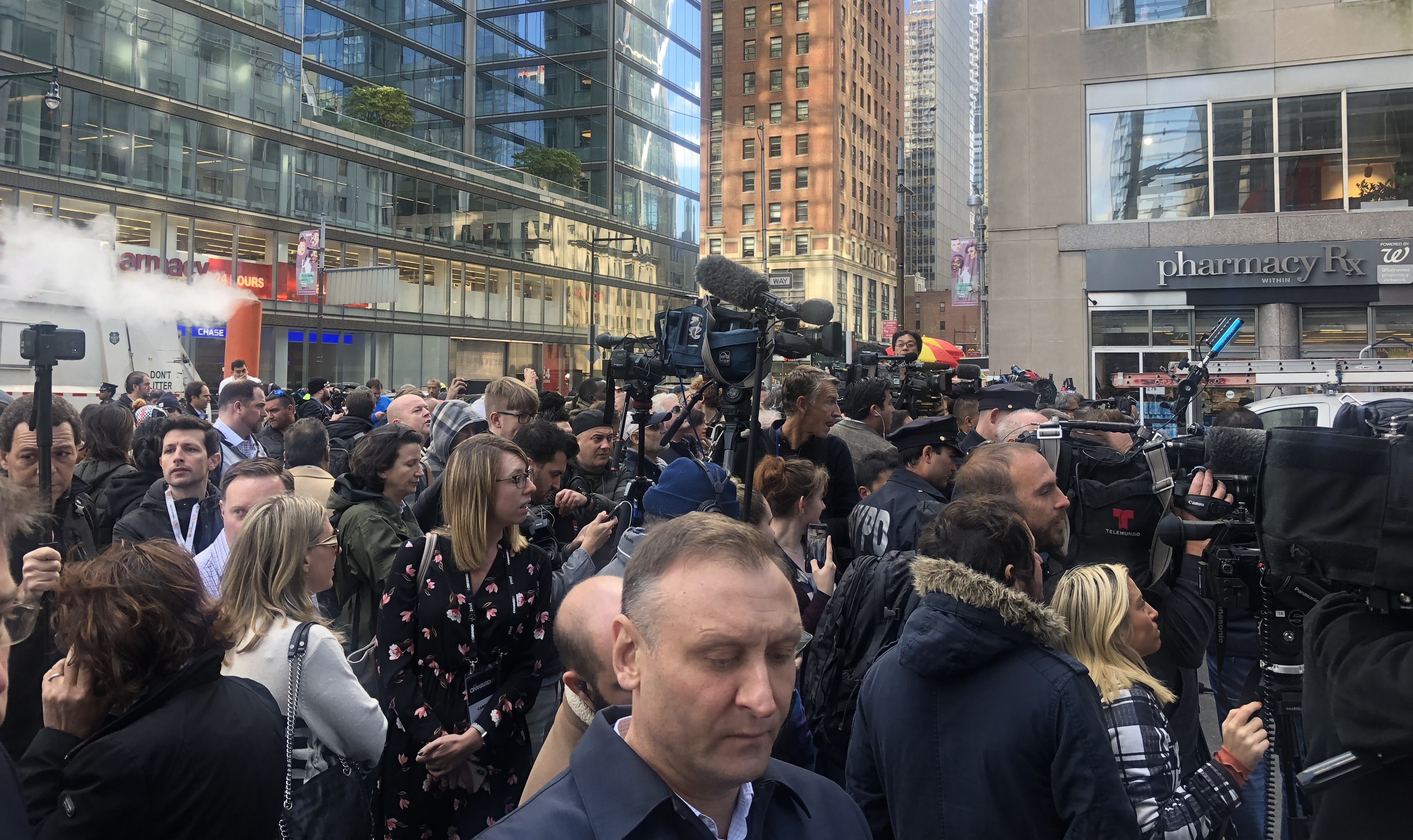 The crew had assembled in front of Fluffy’s Pizzeria in Manhattan around 11:30am, on the corner of 57th Street and 9th Avenue. CNN anchors Poppy Harlow and Jim Sciutto, who had evacuated the Time Warner building in Columbus Circle an hour earlier after a pipe bomb was sent to the CNN newsroom, were preparing to go live just blocks away from their own studios. Before the cameras caught up with them, the pair reported live on the air using their phones. “They say the device is inside CNN’s building. It was a package that was mailed,” Sciutto told the camera. In the meantime, they’d attracted a crowd of gawking pedestrians and other journalists, clamoring for footage of the building’s employees.