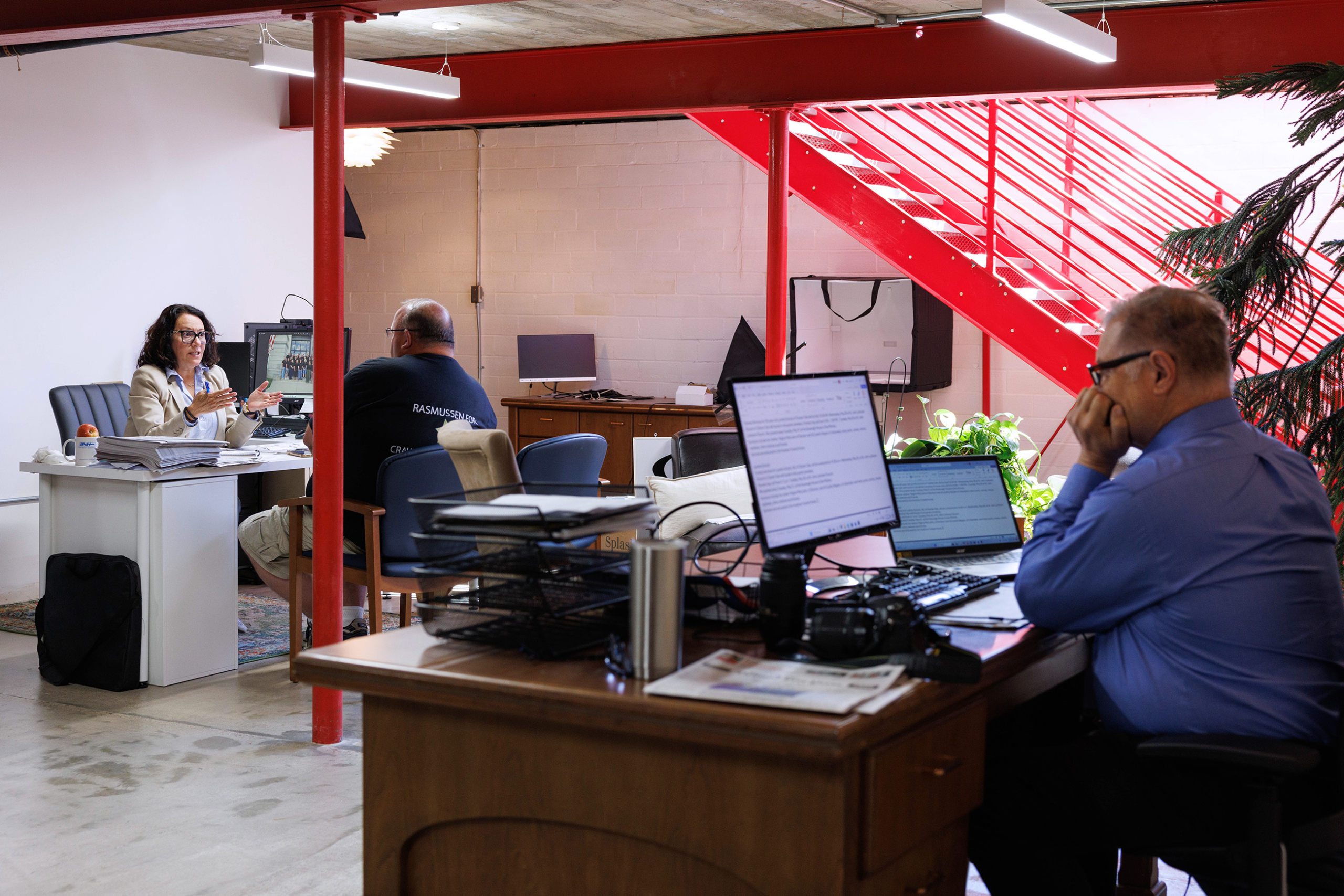 El día después del caucus republicano de este año, López se sentó en su escritorio en la oficina de La Prensa, en el segundo piso del Teatro Donna Reed (llamado así por la residente más famosa de la ciudad). Es un espacio tipo loft con pisos de madera antiguos y oscuros, y grandes ventanas que dan a Broadway, la calle principal de la ciudad. López, con una elegante camisa de lana, se conducía con la confianza de una locutora con mucha experiencia. La noche anterior, había asistido al caucus en el high school local, donde los votantes se pusieron de pie para hablar en favor de sus candidatos preferidos: Trump, Ron DeSantis y Nikki Haley. (López había entrevistado a Haley el año anterior). En el auditorio, López buscó latinos. “Sólo encontré tres,” dijo. Iowa, que es de los primeros caucus presidenciales del país, no ofrece traducción ni programación en español, lo cual dificulta la participación de algunos. Por años, López ha promovido que el gobierno de la ciudad ofrezca traducción al español en las reuniones públicas. Esto aún no se ha materializado; mientras tanto, ella ofrece traducciones en La Prensa.