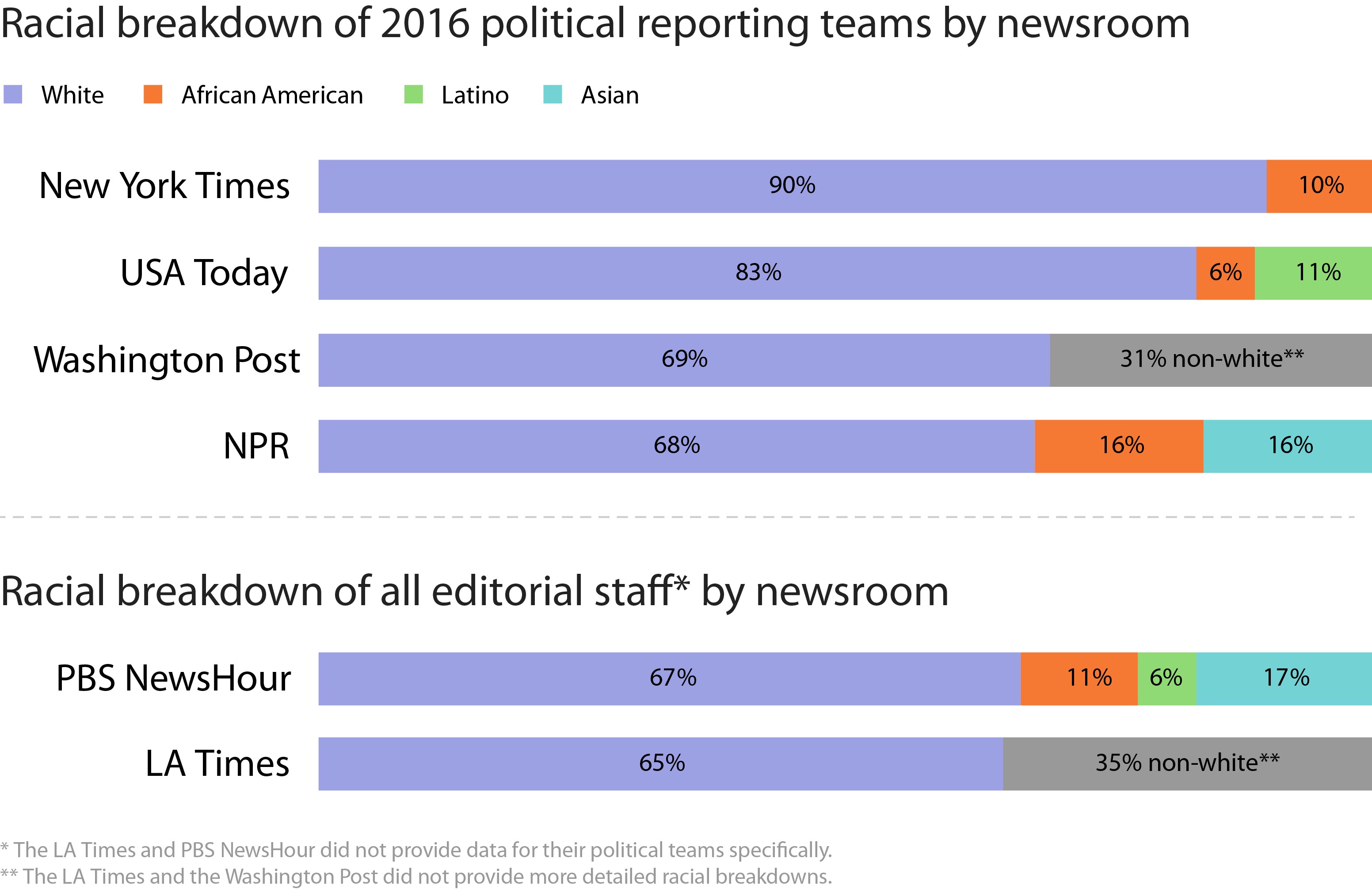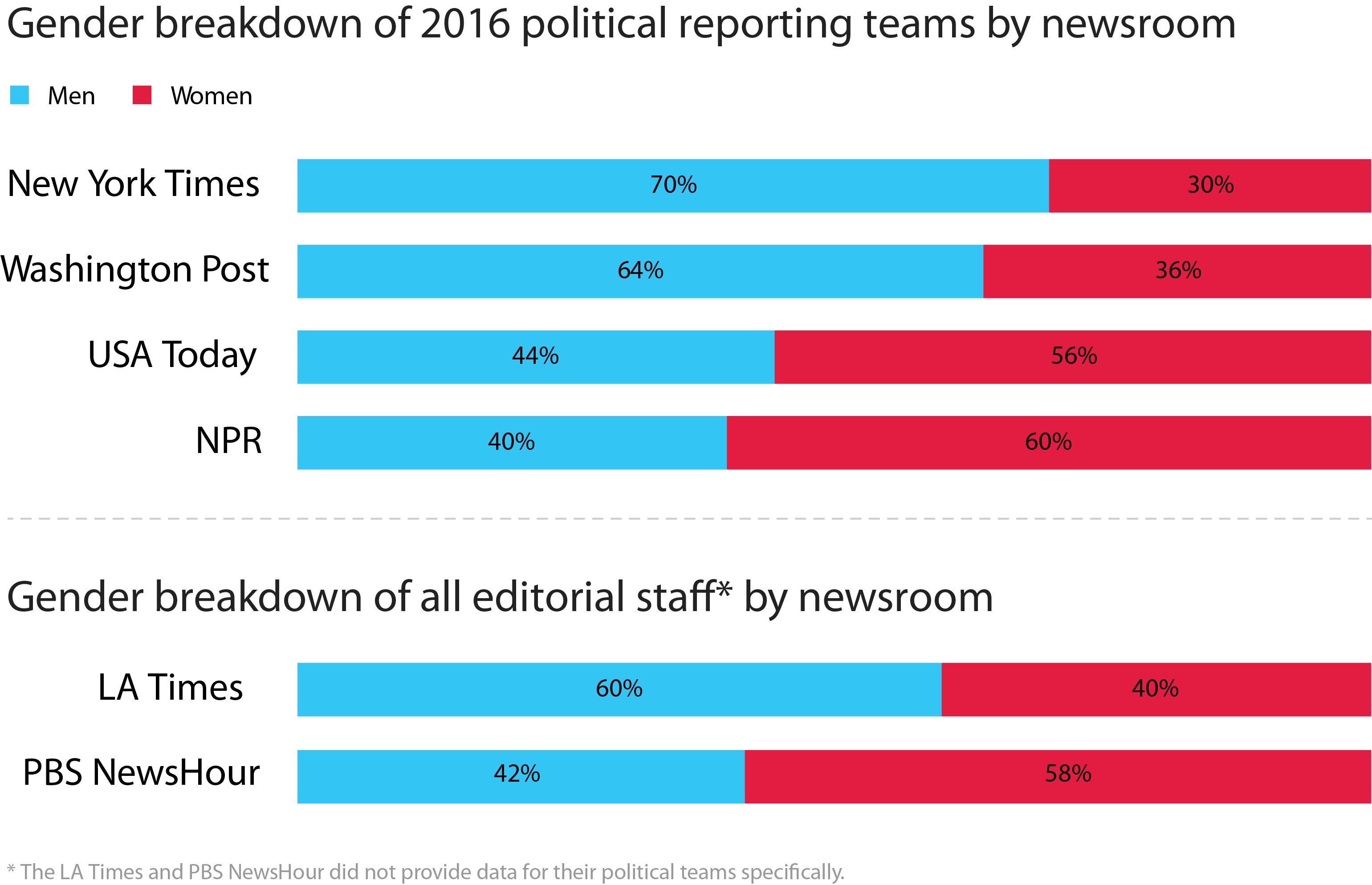 That said, a few newsrooms quickly responded to my query, and commented in depth. Within half an hour of my request, USA Today responded that its 2016 campaign coverage staff had 10 women and eight men, and, among those, two Latinx reporters and one African-American reporter. The full study is available here, published by the Shorenstein Center.