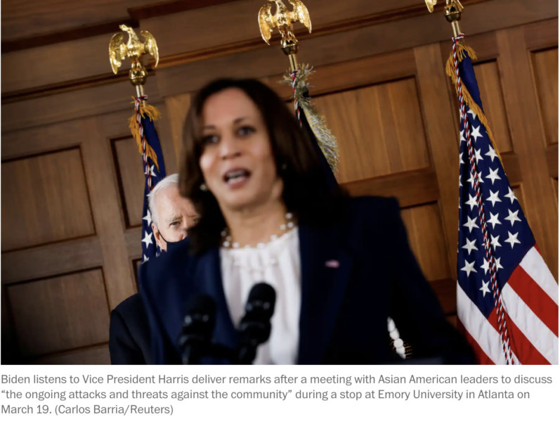 This image of Biden standing behind Kamala Harris on March 19 demonstrates a similar dynamic. Taken by Carlos Barria for Reuters, it was featured in a Washington Post summary of the highlights of President Biden’s first hundred days in office.