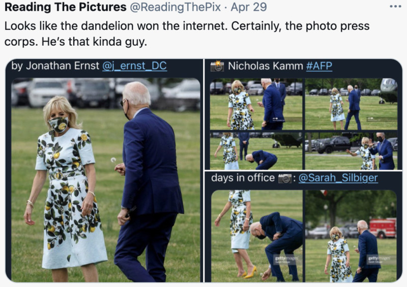 The following morning, Biden and the First Lady crossed the White House lawn to Marine One. The couple was departing for a one-day trip to Georgia to promote Biden’s legislative agenda. Suddenly, in the middle of the lawn, Biden stopped and picked Jill Biden a dandelion. The moment captured the fascination of the photo pool, and the gesture lit up social media.
