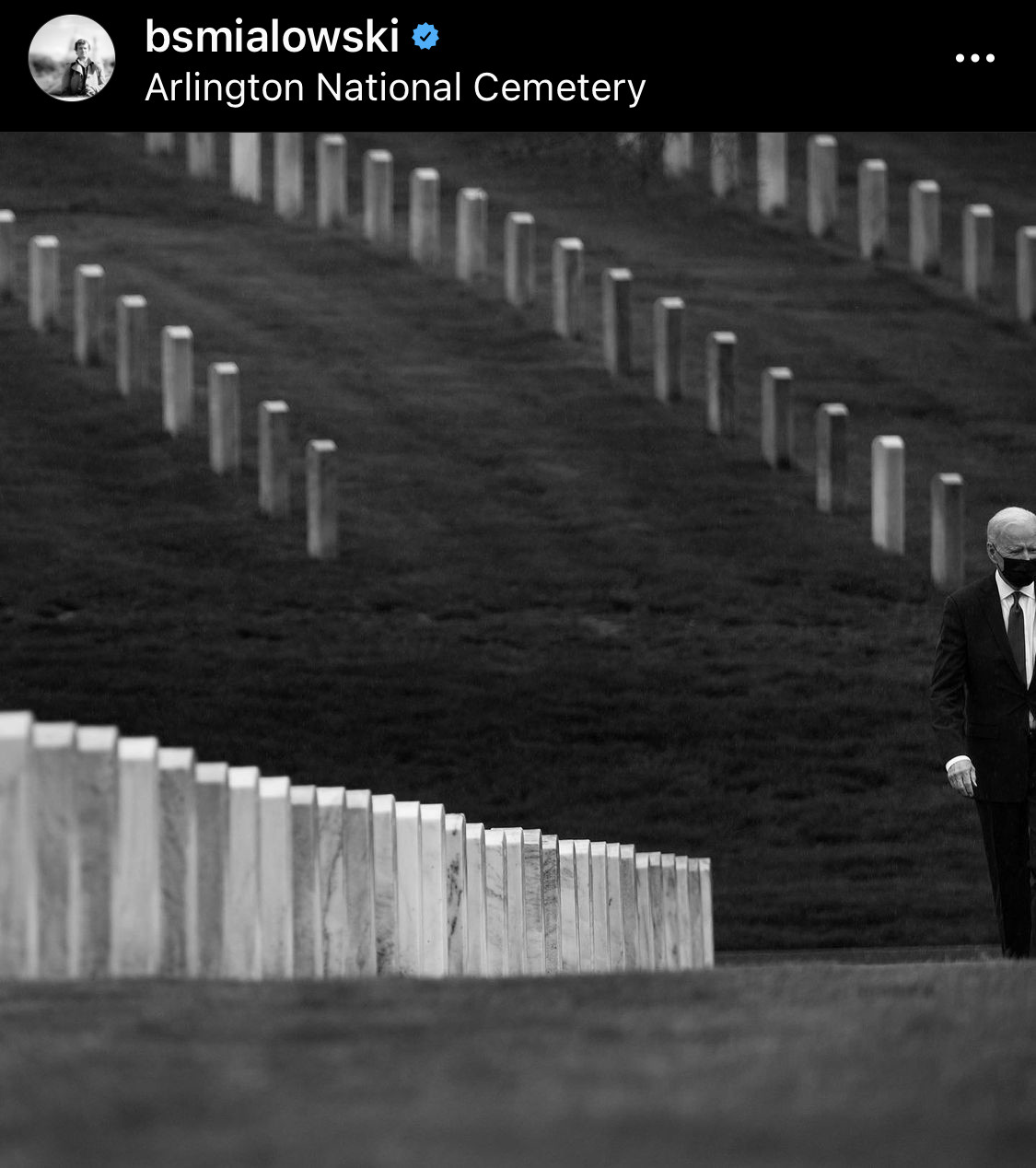 In many other photos, Biden has a lower profile and marginal placement. They indicate a quiet command, or the mark of a steward mindful of goals and principles much greater than himself. Take, for example, this impressionistic image in Arlington National Cemetery, by Brendan Smialowski, a photographer for Getty Images.