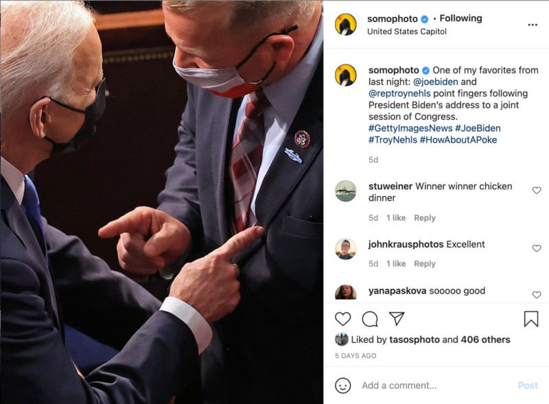 After Biden addressed Congress in a joint session on April 28, Getty’s Chip Somodevilla featured an image on his Instagram page, taken on the House floor after his speech. Biden and Troy Nehls, a conservative representative from Texas, are seen pointing fingers at each other. It seems antagonistic.