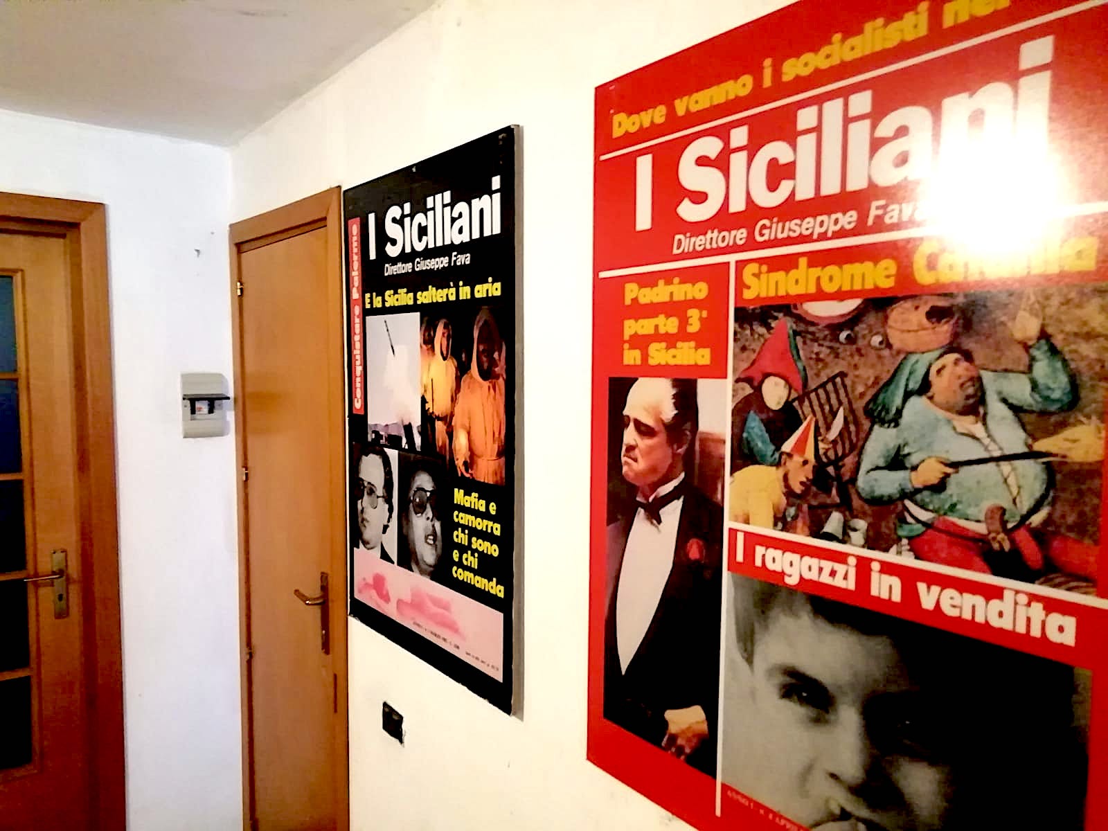 Reproductions of covers from I Siciliani Giovani, a magazine founded by Giuseppe Fava, a Catania journalist killed by the Mafia in 1984. Photo via Stefania Dignoti.