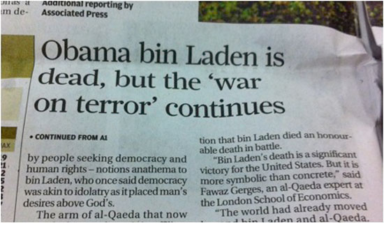 Also, a story in some editions Monday on Page 2 about Osama bin Laden’s life said bin Laden died in the lawless badlands of Pakistan along the Afghanistan border. Bin Laden was killed in a house in Abbottabad, north of Islamabad. The story also repeated a paragraph that had some garbled sentences.” – Chicago Tribune