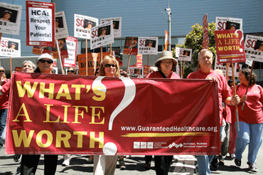 Supporting a single-payer bill sponsored by Michigan Rep. John Conyers, hundreds rallied in cities where large insurance companies are located: Louisville (Humana); Pittsburgh (Highmark); New York (GHI); Jacksonville (Florida Blue Cross Blue Shield); Philadelphia (Cigna). Evoking protests of old, they held signs—“Patients First-Not Profits”—and chanted slogans—“Insurance companies, you’re no good; get a conscience like you should.” The biggest event, attended by more than 1000 people, took place outside San Francisco’s Moscone Center, where AHIP (America’s Health Insurance Plans), the insurance industry’s trade association, was holding an executive summit featuring speakers like ex-senator Bill Frist, D.C. Democratic bigwig Terry McAuliffe, and former Secretary of Health and Human Services Tommy Thompson.