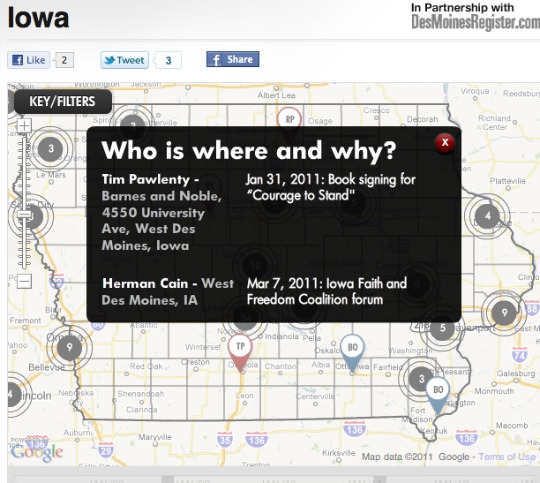 A quick look around the site today reveals micro-reporting on the latest sound bites: “T-Paw: Obama a ‘chicken’”. There are “candidate hubs” with collated stories on each of those unannounced candidates doing the rounds—you can see “T-Paw”’s here. There are other hubs for the four early primary and caucus states—Iowa, New Hampshire, South Carolina, and Nevada. And there’s a map that tracks where candidates are heading and where they have been across the country; Jeremy W. Peters described it in his Times piece as “a feature resembling the Santa Tracker for children on Christmas Eve.” Here is a sample, with the focus on Iowa: