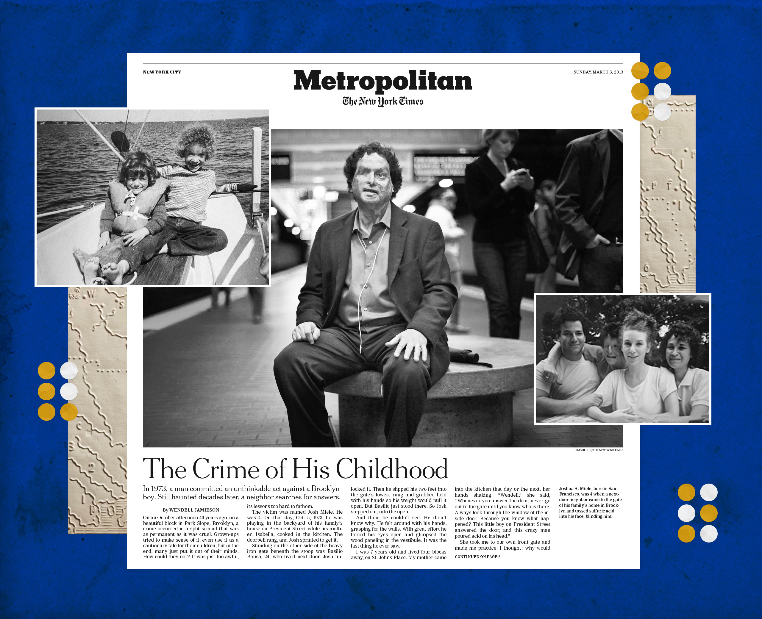 āThe Crime of His Childhoodā ran on March 2, 2013, on the cover of the Timesā Metropolitan section, and spent some time at the top of the homepage that afternoon. As I had feared, the story was mostly about the attack and my recovery; I sighed when I read the headline. But the story did include a healthy chunk about all the stuff I was doing.