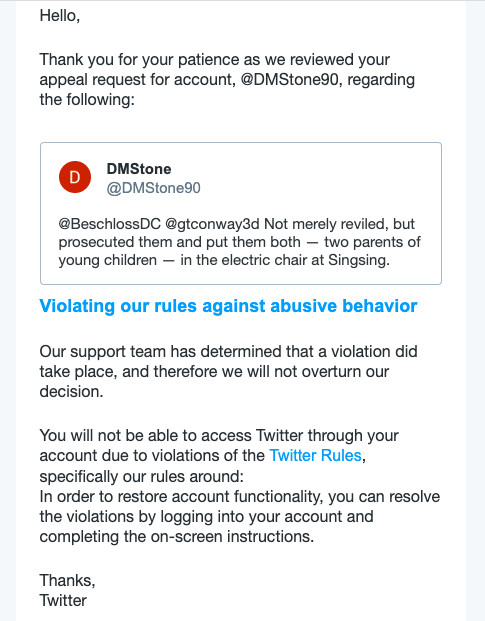 In an email appealing my suspension, I explained that I was commenting with purely factual statements about a well-known legal and political case from seventy years ago, involving the long-deceased figure Beschloss had himself cited. Surely, actual people would realize this error in flagging this uncontroversial and purely historical statement as abusive.Â
