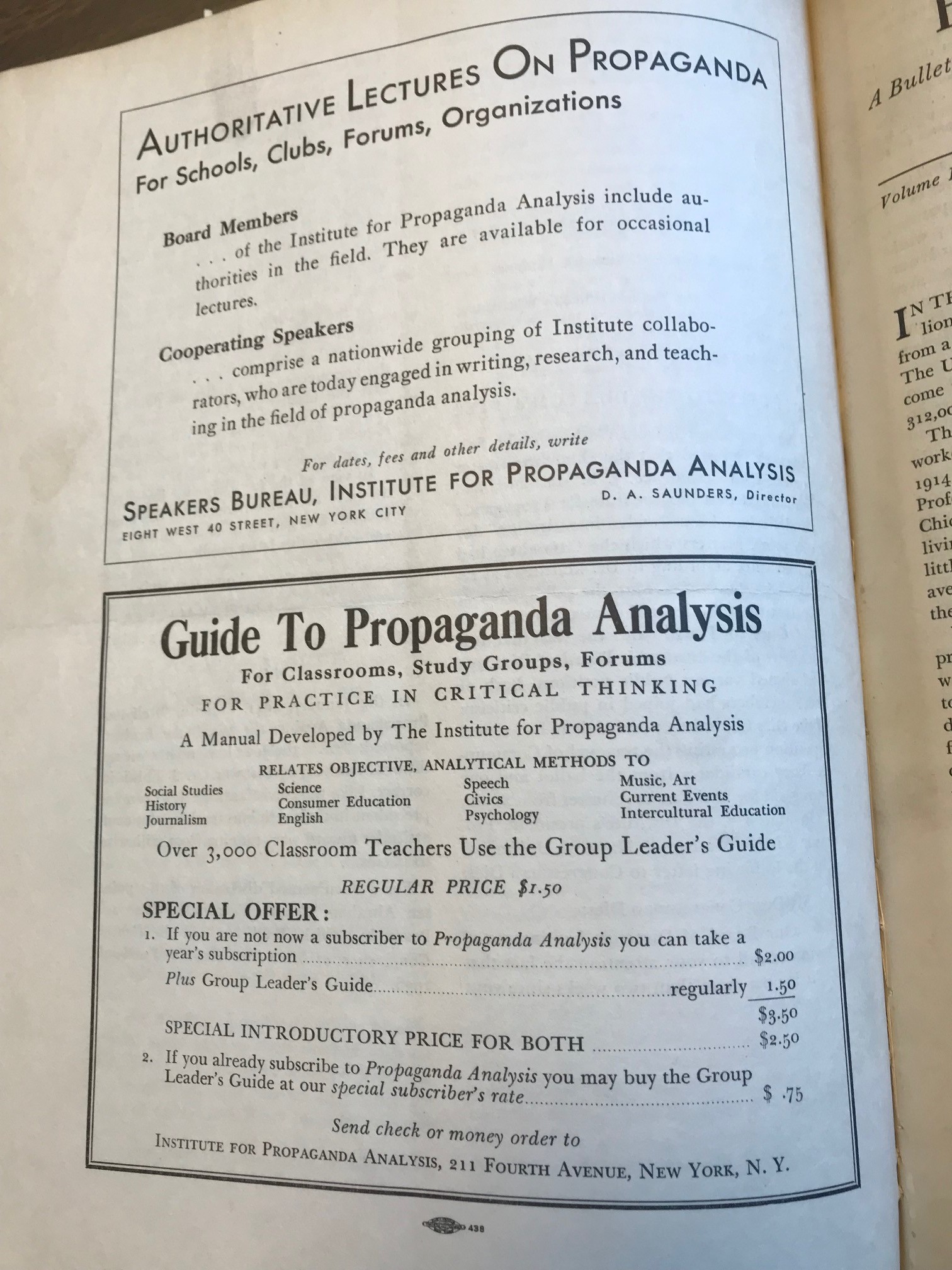 Additionally, many of the techniques the IPA pioneered are still used today in media-literacy training classes in US schools. Many take as their foundation the IPA’s pioneering ideas about how best to understand and combat propaganda, including a belief in the need for personal reflection and for understanding how personal experience shapes one’s ideas.