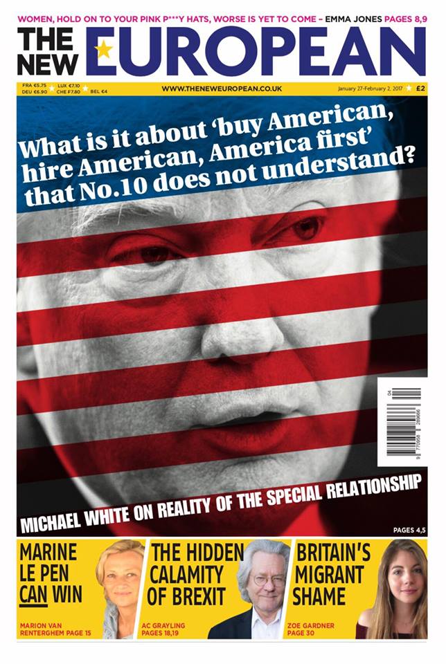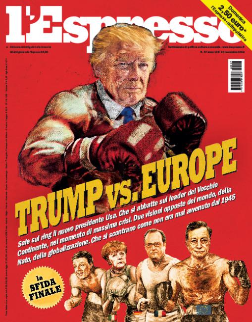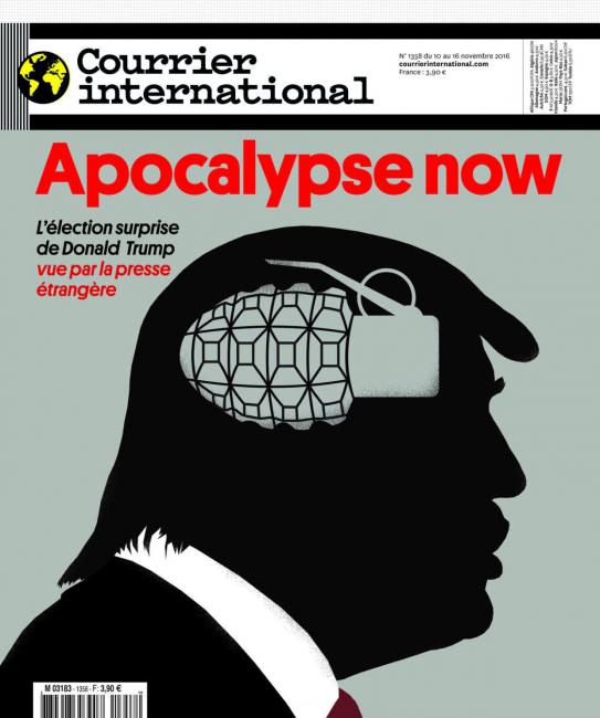 For news designers, the color palette is the easy part. Everything about Trump relies on two powerful hues—orange and yellow. Caricatures have never been more popular. “I think newspapers have seen caricature as an obvious response to Trump because he is such a caricature of a man,” says Matt Kelly, editor of the UK’s The New European, in an email. We also see a lot red, white, and blue, and American flags, as in these pages from The New European, Aftenposten (Norway) and The Telegraph (UK).