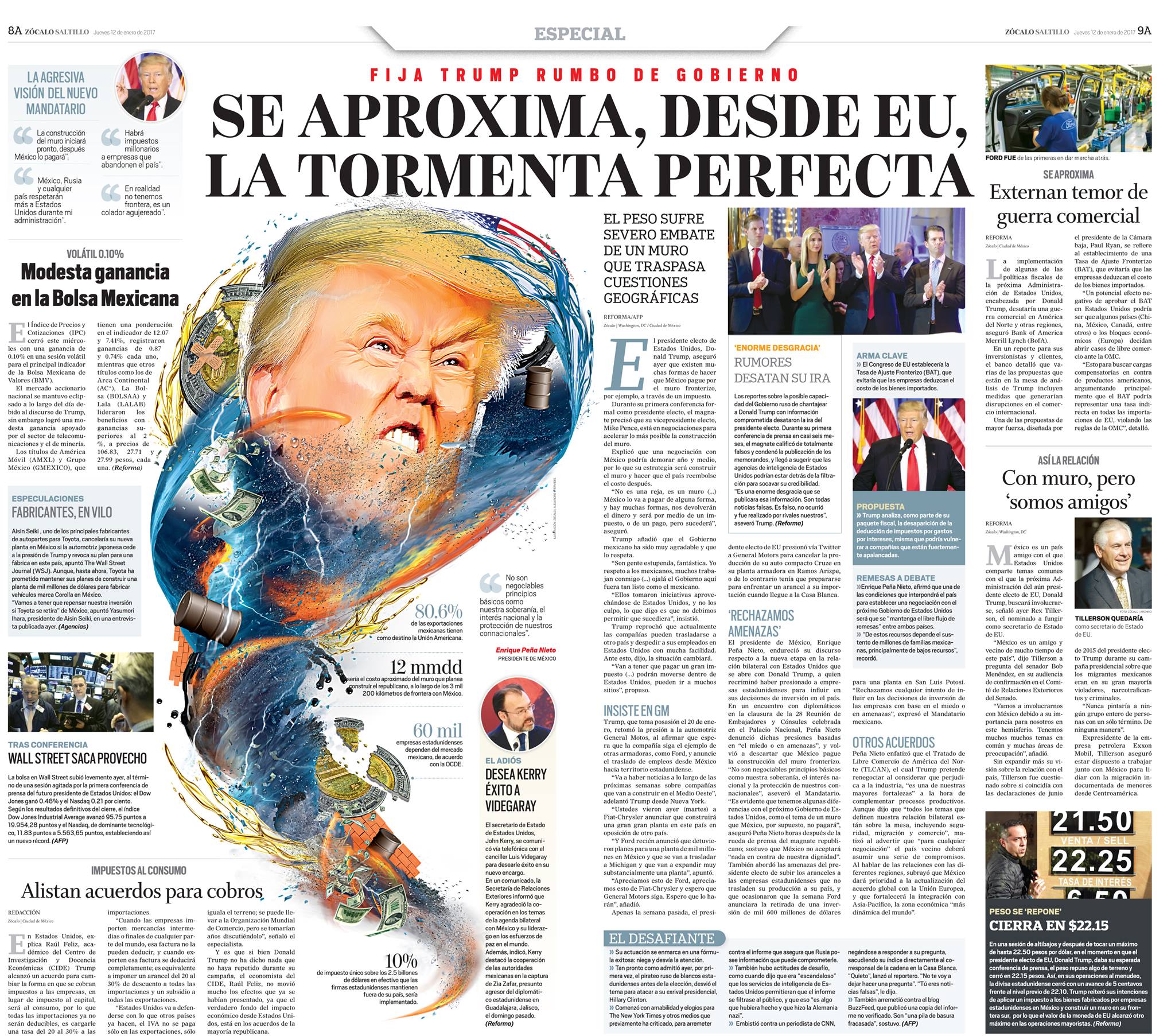 And a double page spread from El Zocalo (Saltillo) carries a headline that reads (translated): “Getting near, from the US, the perfect storm.”