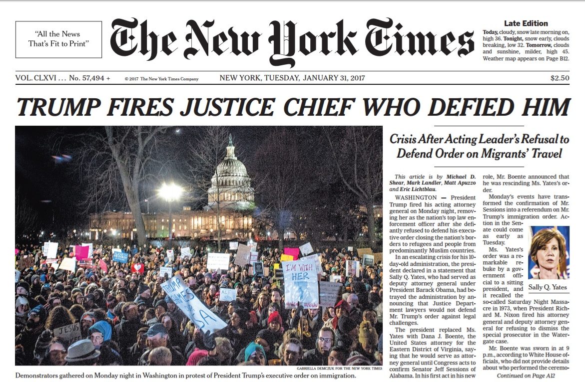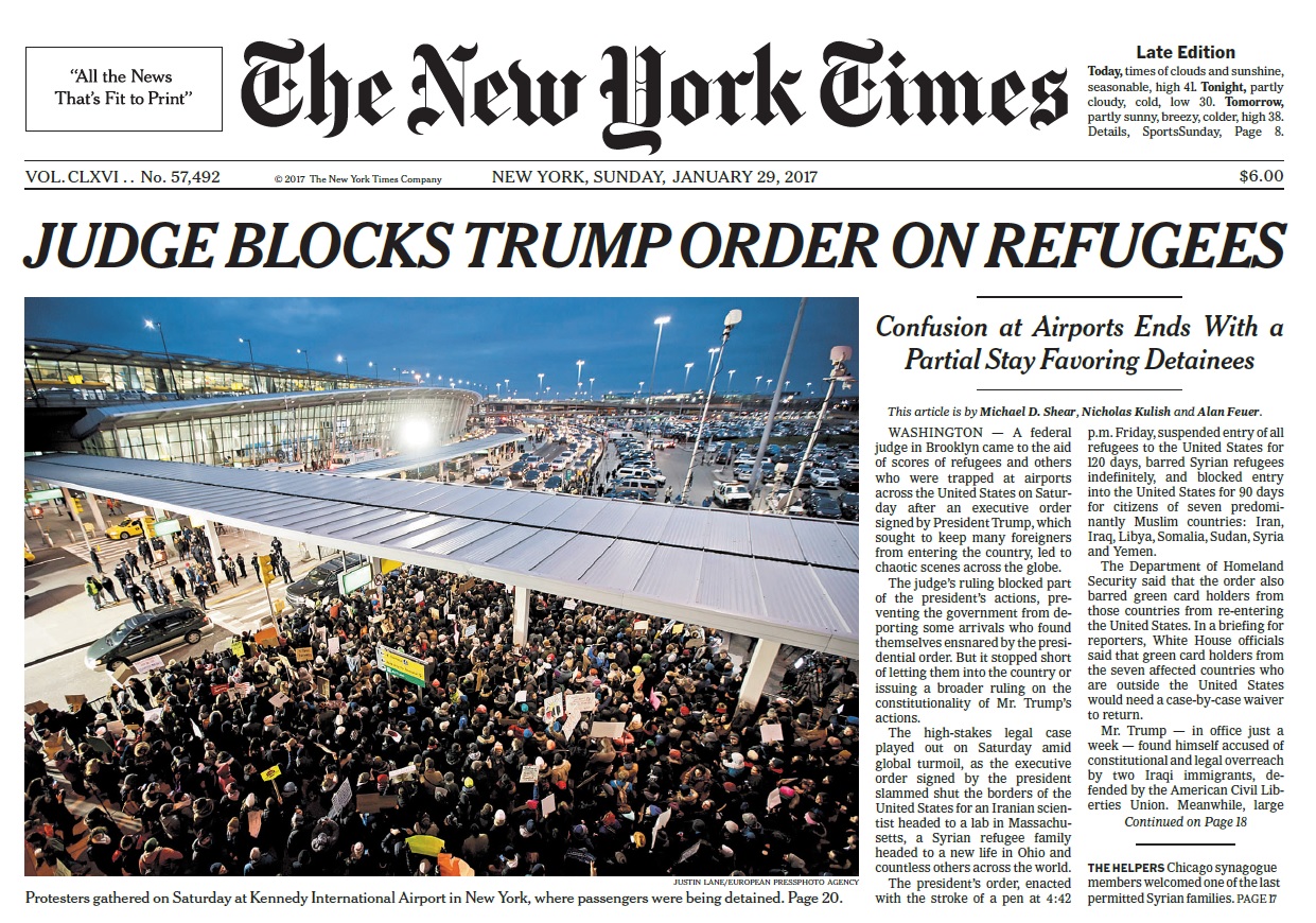 Meantime, The New York Times carried a six-column headline in all caps—“Judge Blocks Trump Order on Refugees”—on the cover of its late print edition on January 29, a treatment we don’t see too often and which alerts us to a story of major significance. The Times used the same template two days later for a headline about Trump firing the acting attorney general.