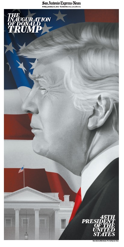 Using dramatic photo crops of President Trump’s head is how some art directors solve the issue of showing more than just the familiar face that appears in so many publications at the same time. Here we see such treatments in Brazil’s Veja, The Stranger (US), Le Nouvel Observateur (France), and the San Antonio Express-News.