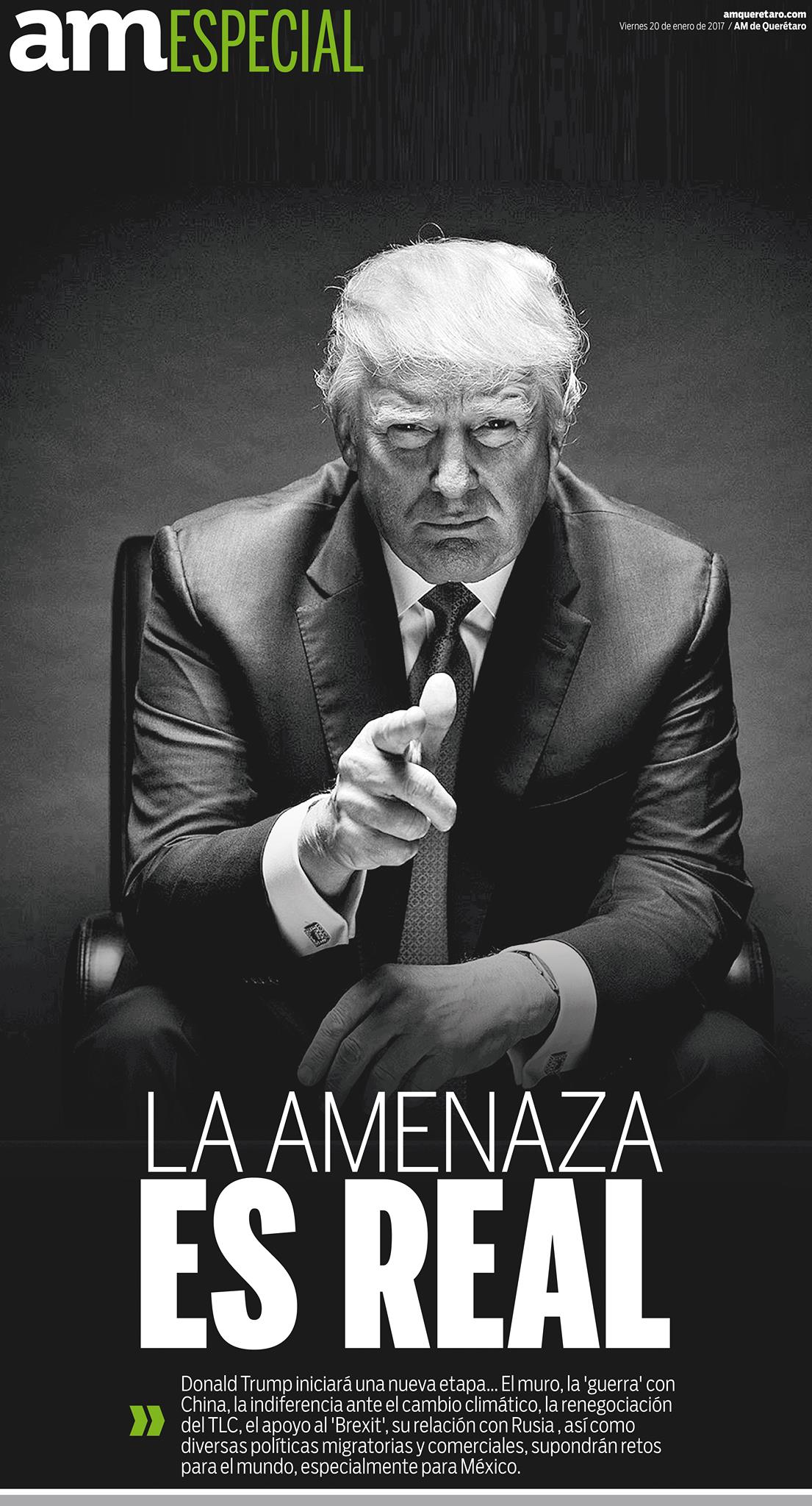 President Trump’s promised “Wall” along the Mexican border has in particular inspired news designers and journalists south of the US border. This front page from Mexico’s am carries only type on the cover for a headline that reads: “Let’s Make Mexico Great Again.” Another section uses the headline: “The Threat is Real.”