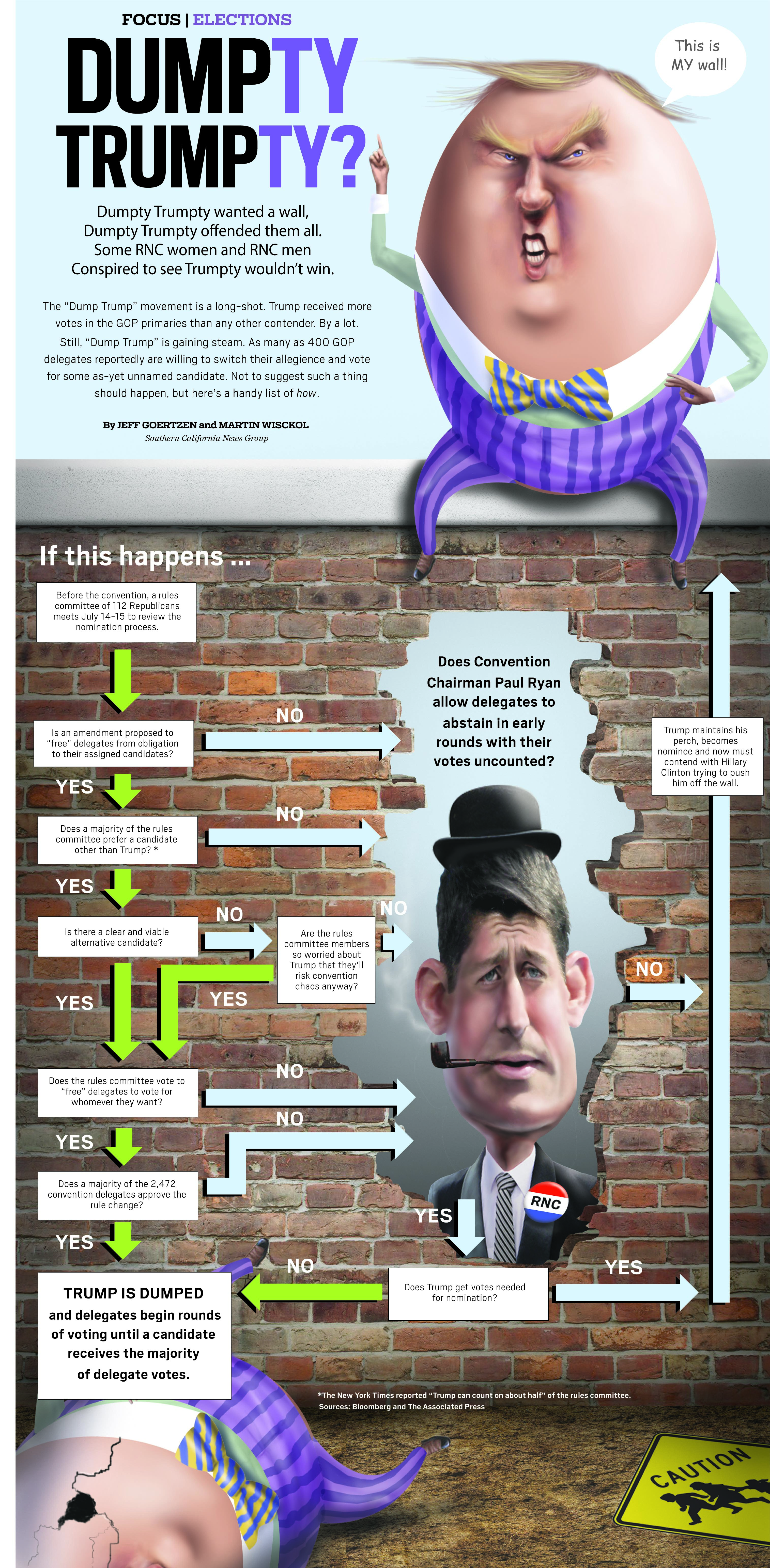 I spoke with him about his inspiration: “The Dumpty Trumpty page took a satirical look at the process that would have to unfold for the RNC to effectively dump Trump. The building of a ‘wall’ and the words ‘Dump Trump’ suddenly gave me the idea to illustrate Donald Trump as Humpty Dumpty and use it in this context to explain the complicated process of what it would take for the RNC to Dump Trump,” he says. “I received a few phone calls from angry readers for this one for publishing it in our news section with such political overtones.”
