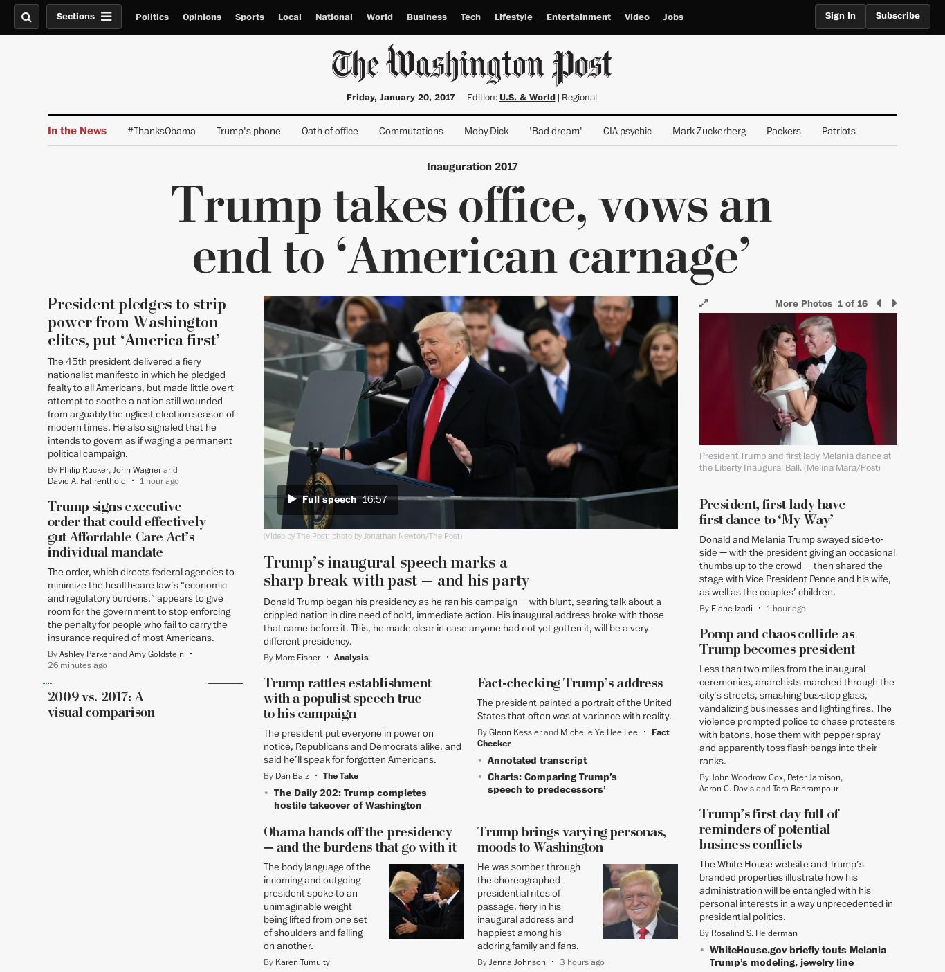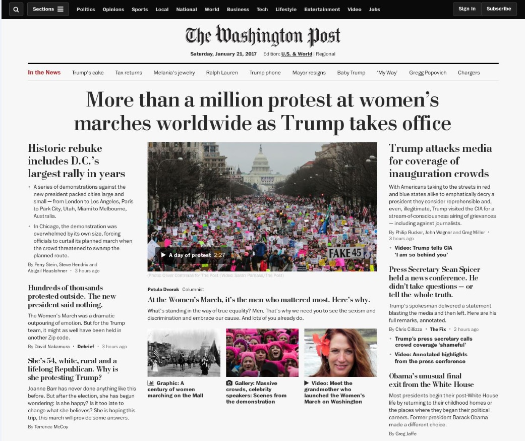 Even traditional publications such as The New York Times and The Washington Post, which tend to save multi-column headlines for stories of major significance, have displayed larger headlines more often—in print and online—since the inauguration of President Trump. It’s tough to see the one-column headlines when the news agenda is packed with stories that compete for top billing. Take a look at these multi-column headlines from WashingtonPost.com.
