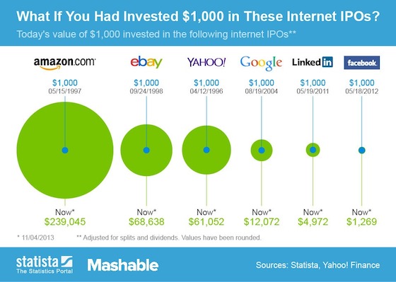 That $239,045 Mashable and Statista say you’d have from your Amazon.com wager turns out to be $143,300 in the real world. Had you bought $1,000 of eBay when it opened, you’d have $23,000, not $68,638. With LinkedIn, you’d have $2,500, not $4,972. Good gains all, but not as good as the chart leads you to believe.