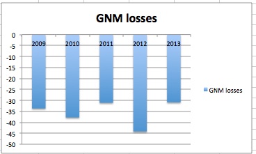 How huge? Put it this way: The group doesn’t even talk about profits for GNM, only getting losses to “sustainable levels.” Right now, they are not. Here’s what they look like for the past five years (the figures are in millions GBP).