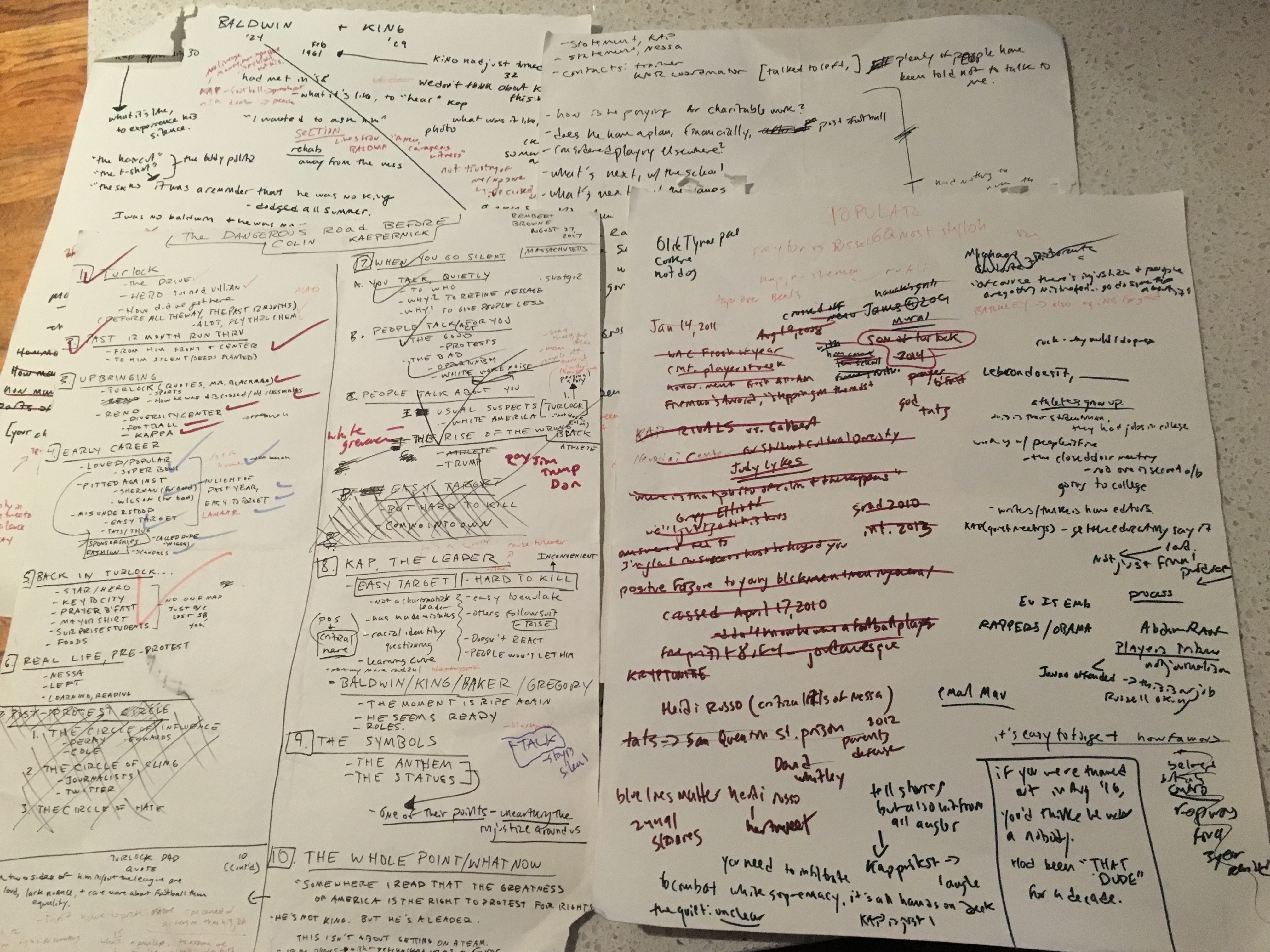 I spent a week and a half writing an outline. I had some themes I knew needed to go in there. It was basically like writing two pieces; there was the Kaepernick stuff, and the non-Kaepernick stuff.