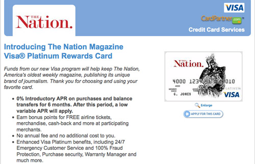 Update: Thanks to Scott Klein, currently of ProPublica and formerly of The Nation, who informs me that a Nation Visa card is nothing new; in fact, it’s been around since 1998.