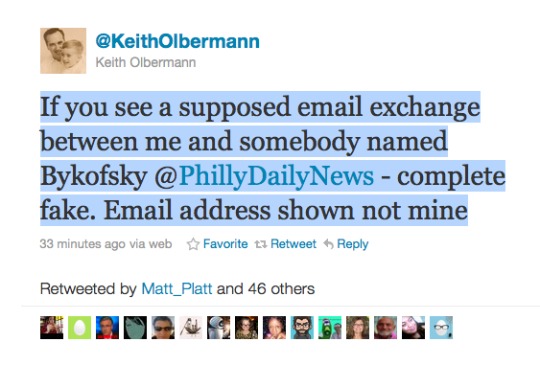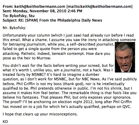 So it was interesting to see that Olbermann allegedly sent some angry emails to the Philadelphia Daily News’ Stu Bykofsky using the email address keith@keitholbermann.com.