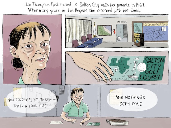 Cagle’s piece about California’s Salton Sea is far more data-heavy. She provides dense captions to her illustrations, such as: “For much of the last millenium, the Salton Sea was more than 20 times larger than it was today” or “After many years of modest growth, Salton City’s population nearly quadrupled between 2000 and 2010.” Her piece includes an annotated map of the region, a spread of the different species of birds found in California’s wetlands, and a line graph of Salton Sea’s salinity over time — the water will be inhospitable to sea life within the next five years. “The 2017 deadline doesn’t seem so close until you are seaside, breathing the thick, rotting air as a haze settles over hundreds of lunching pelicans,” Cagle writes in the final caption over a drawing of Salton’s shore. Cagle’s illustrations are subtler than a traditional cartoon. Her depiction of Salton is neither eerily utopic nor nightmarish. Her drawings capture what people of Salton City look like — their simple, colorful clothes have a low-pressure, vacation-community feel, but their worried expressions suggest otherwise. She relies on quotes to capture the superficial pleasures of affordable, seaside living and uses statistics to show that life there will not continue as is for much longer.