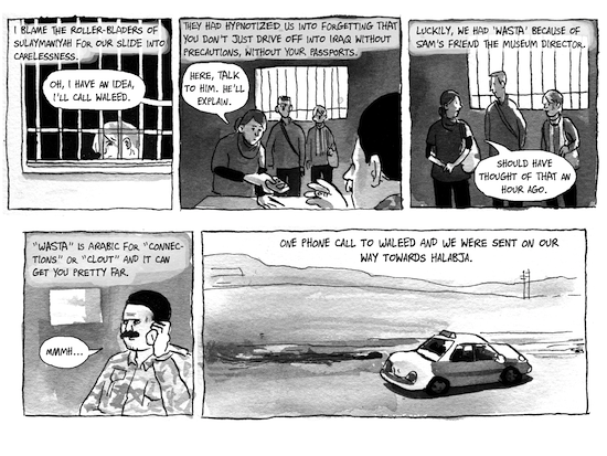 Not all of the pieces in Symbolia are straight-journalism. Glidden’s piece about Sulaymaniyah, Iraq’s comparatively peaceful northernmost region, is more of a road diary than an article. Glidden visits Freedom Park, with its Ferris wheel and roller-skating rink, and draws teenagers pulling flips off the ramps. In 1988, Sadam Hussein’s cousin ordered a poison gas attack in Halabja, a city in Sulaymaniyah. Glidden replicates a mural composed of 8,830 shards of glass — one for each person killed during the gassing. The comic, with its ominous grayscale palette, underscores the fact that peace in Sulaymaniyah is as fragile as ever.