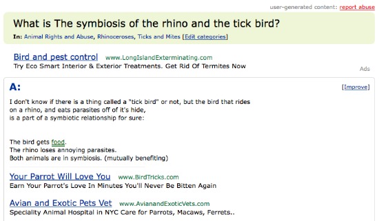 Parenthetically, when I started writing this post I was trying to remember the name of that little bird that rides on top of the rhinocerous. It turned out to not be the best metaphor to use, because, as I remembered, the rhino and the tickbird have a symbiotic, rather than parasitic, relationship. A more fitting metaphor for spammers might be a tapeworm, or some kind of viral infection. In any case, I mention it just to point out that when I typed in “bird on rhinocerous,” Google led me to this truly illuminating page on Answers.com: