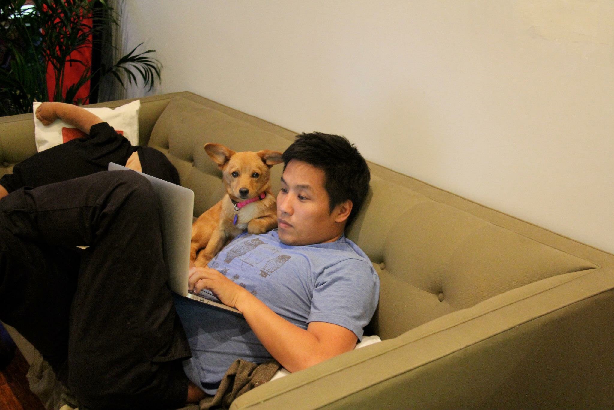 Jay Caspian Kang hard at work with his writing assistant, his dog Chito, a Chihuahua mix. Courtesy photo.