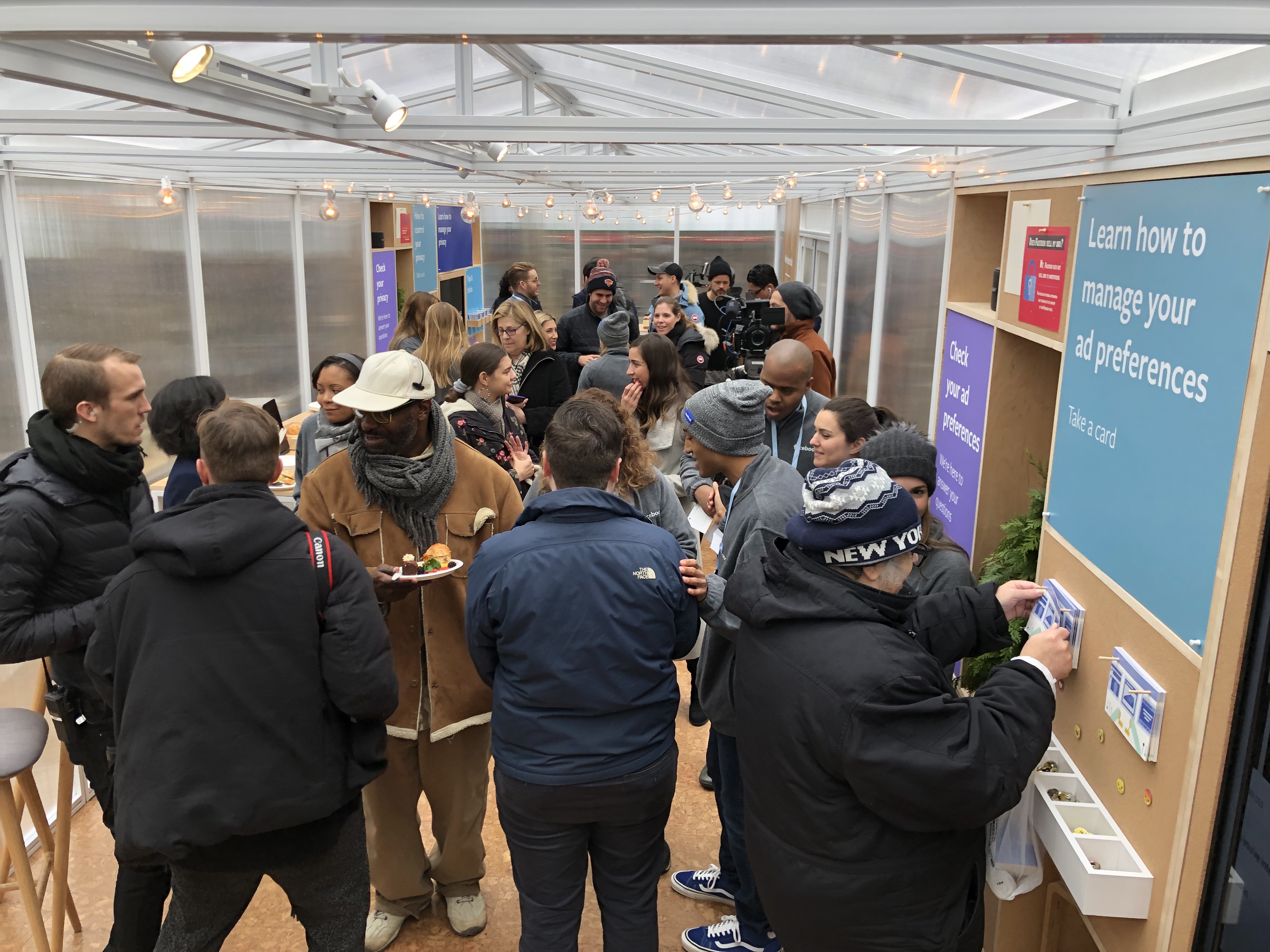 For Facebook, the focus was on seeming nice. As pedestrians wandered in, a Facebook PR staffer would offer them hot drinks and “privacy checkups,” the infelicitous name of Facebook’s how-to guide for a few of its settings, none of which govern Facebook’s data collection. As visitors walked out, a news camera crew stood waiting to ask them what they thought about the project (“Are you a reporter?” asked someone from the Associated Press as soon as I walked through the door).