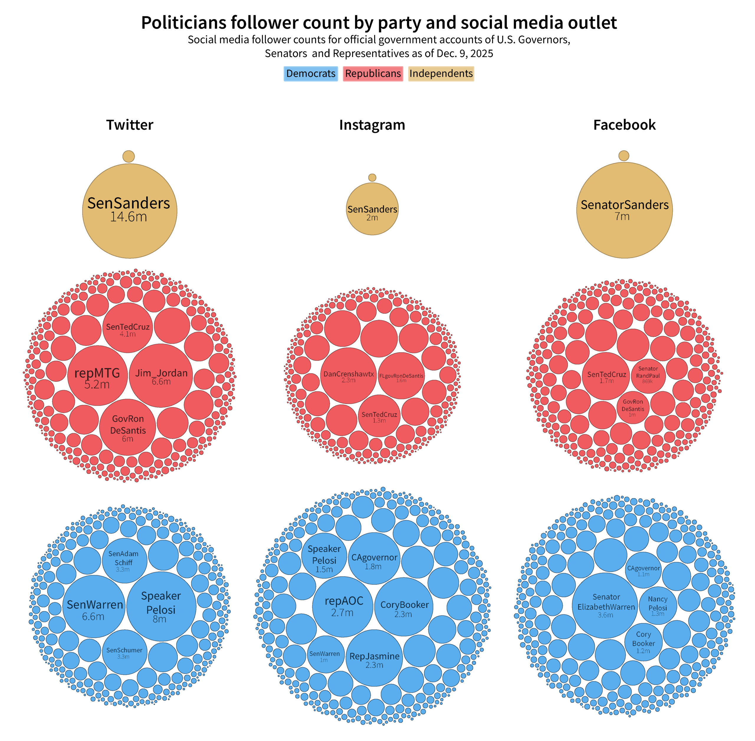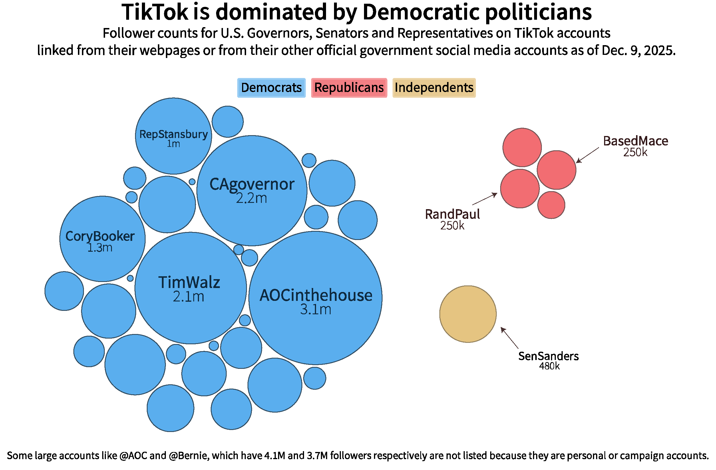 To see how politicians fare on newer and more visual media, we also pulled their TikTok accounts. But for this platform we included both official and unofficial accounts. That’s because very few elected officials hold accounts on the platform at all, and fewer yet advertise them as official communications on their government websites. The TikTok deal President Trump supposedly brokered has yet to be formally finalized, and the platform is still banned on government-owned technology. Despite the White House’s recent embrace of the platform, the elected officials who have built successful followings on TikTok are still mostly Democrats.