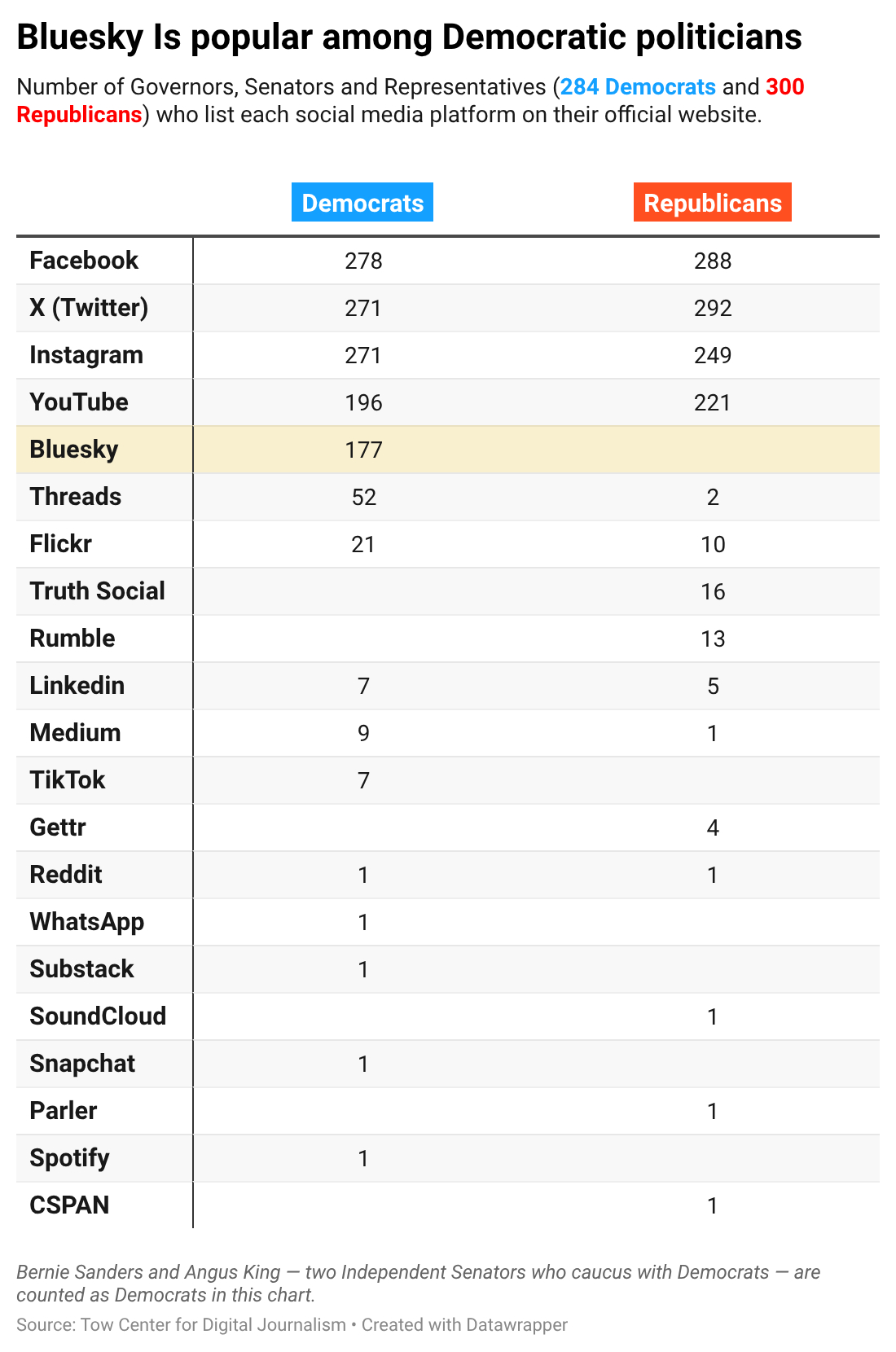 As the social media environment has fractured, some politicians have moved to more partisan platforms. Bluesky gained popularity among journalists and academics and so too, it seems, among Democratic politicians. To see how much elected officials have moved away from mainstream platforms, we navigated to every governor’s, senator’s, and representative’s official website and collected the mentions of any social media platform on their homepage.