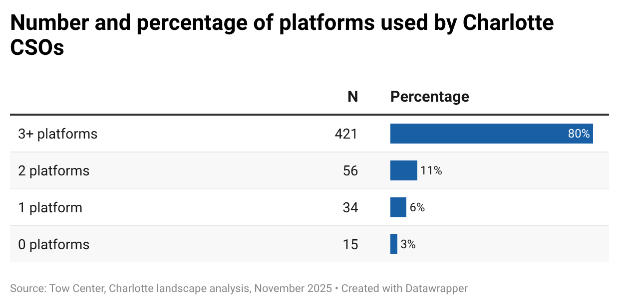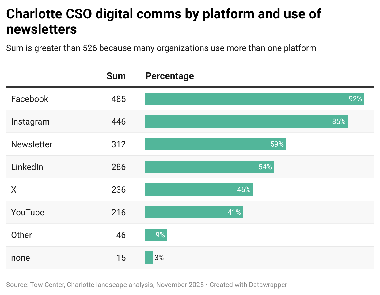 - Most Charlotte CSOs are very active on social media, with more than 80 percent of our sample using three or more platforms to reach their constituents. The most common platforms are Facebook and Instagram; 60 percent have email newsletters.