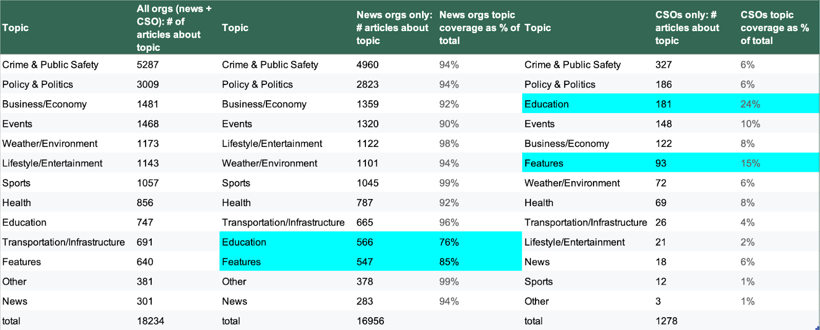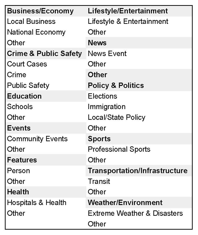 In addition to the local news outlet census, we produced two tools with which to analyze Charlotte local news and civic information: one to code and analyze articles by topic, and another to map coverage areas according to locations mentioned in each article. We’ll focus first on the topic analysis. In total, we analyzed 18,234 articles by both local news outlets and CSOs (see Appendix B for a detailed methodology). The topics (and subtopics) we used were as follows: