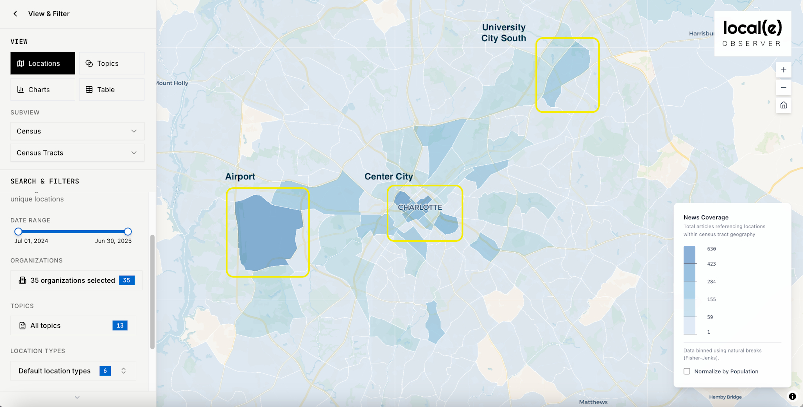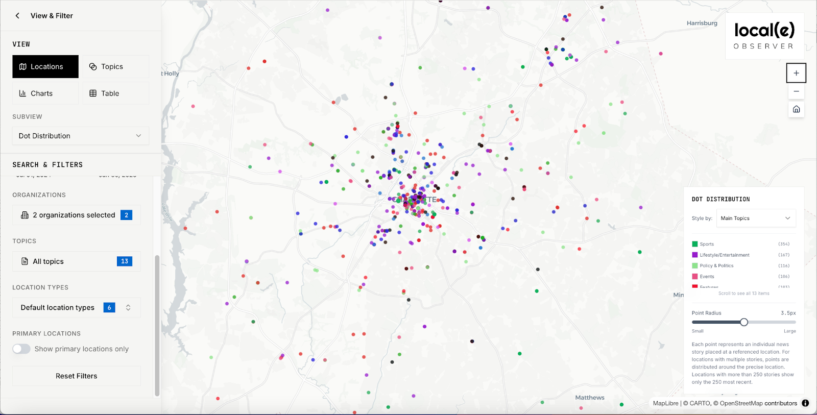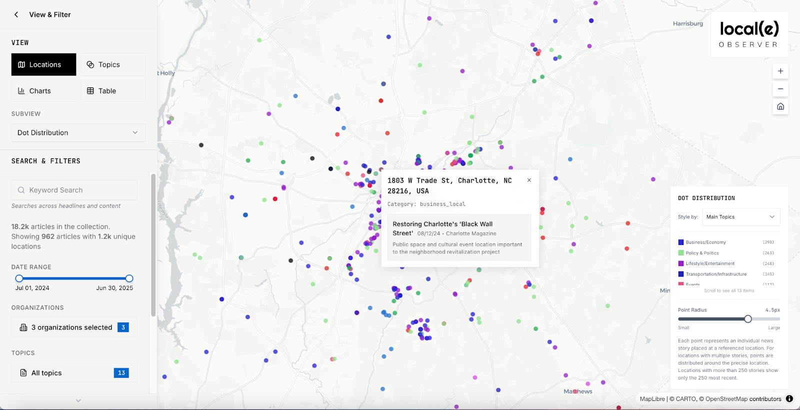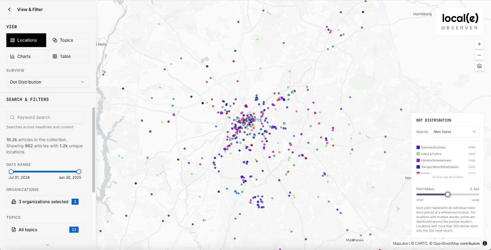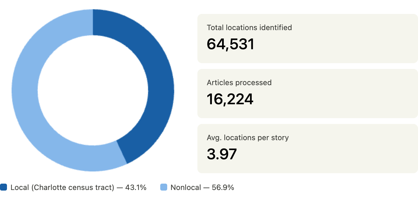 We coupled a local news provider census with a content analysis that allows for mapping of both coverage areas and topics covered. Using LLMs, we have applied newly developed tools for understanding Charlotte’s local news and information landscape.