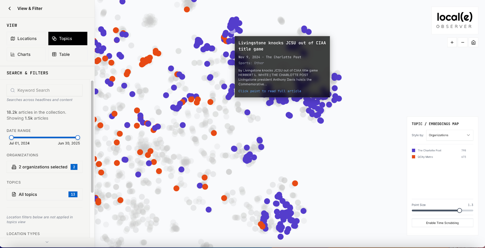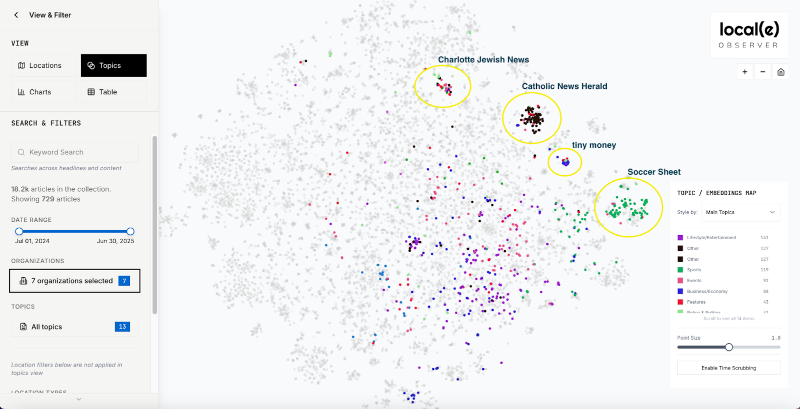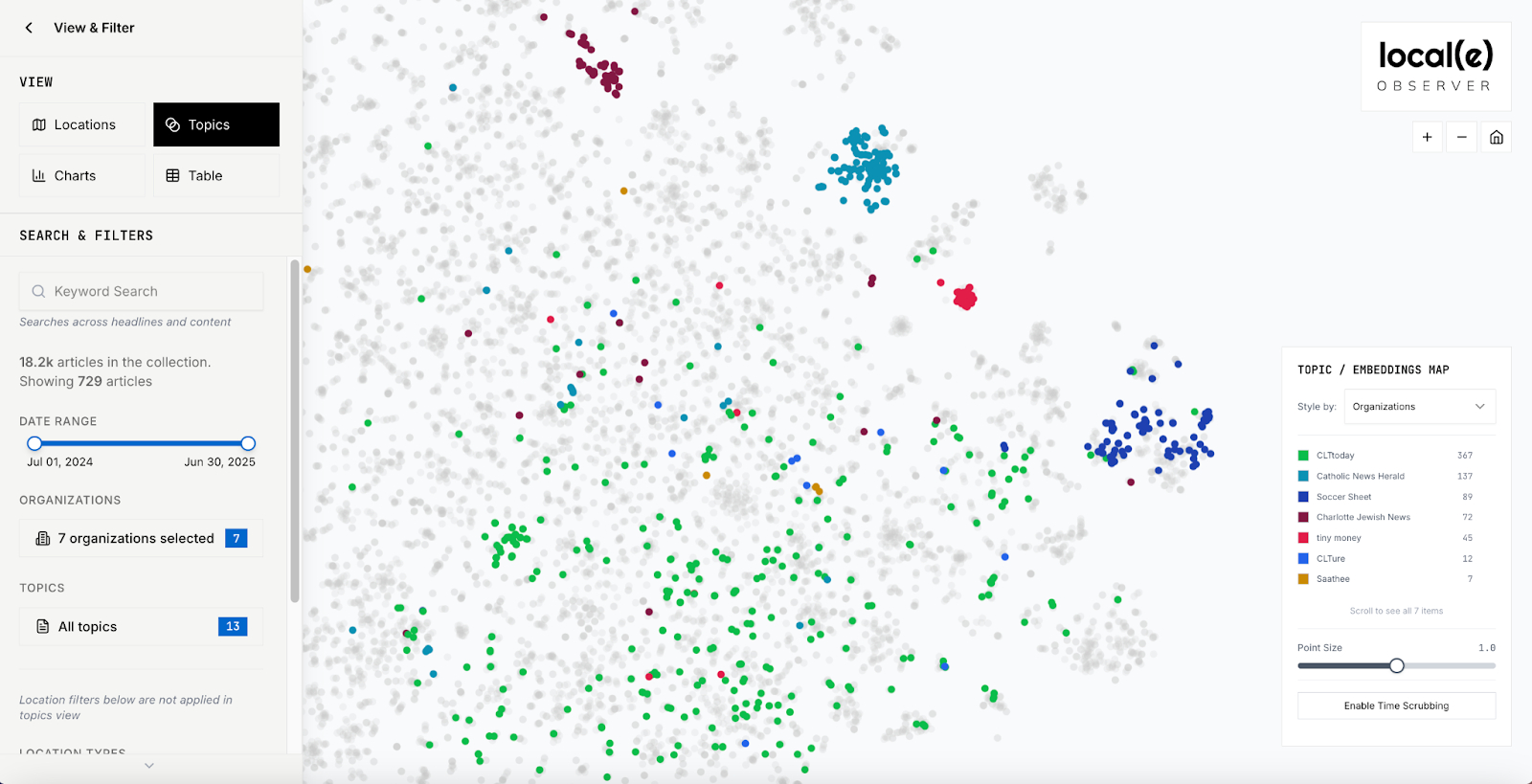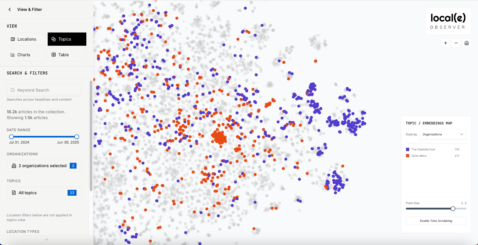 We coupled a local news provider census with a content analysis that allows for mapping of both coverage areas and topics covered. Using LLMs, we have applied newly developed tools for understanding Charlotte’s local news and information landscape.