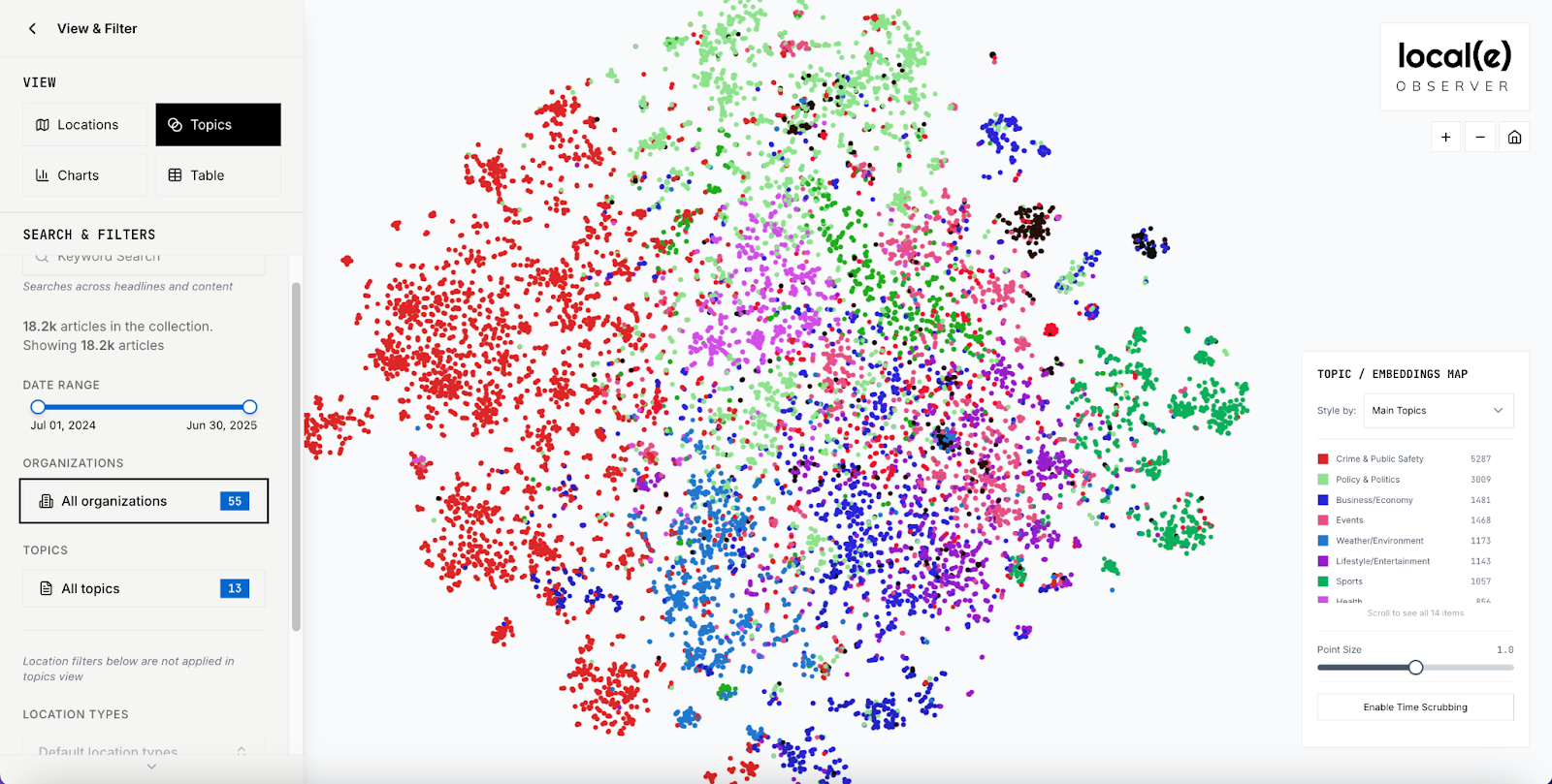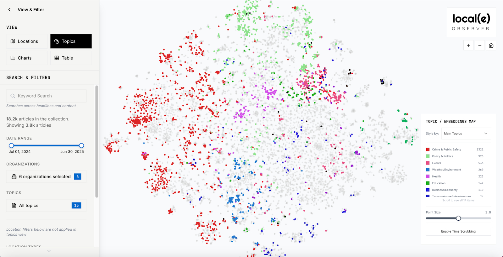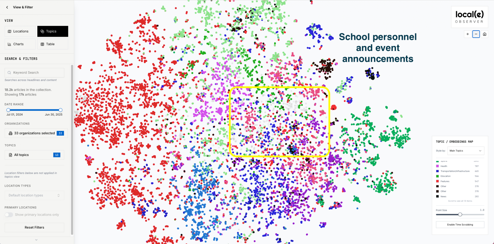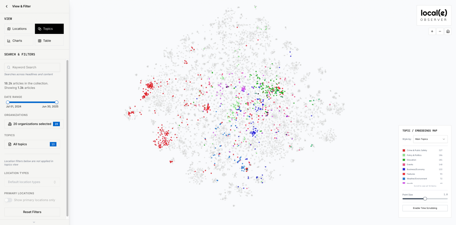 At the same time, the advent of artificial intelligence and advanced computational tools has allowed local news mapping to make giant leaps forward. Research can now go beyond the traditional local news outlet census to analyze content for both breadth of topics covered and detailed geographic coverage areas—down to the census-tract level.