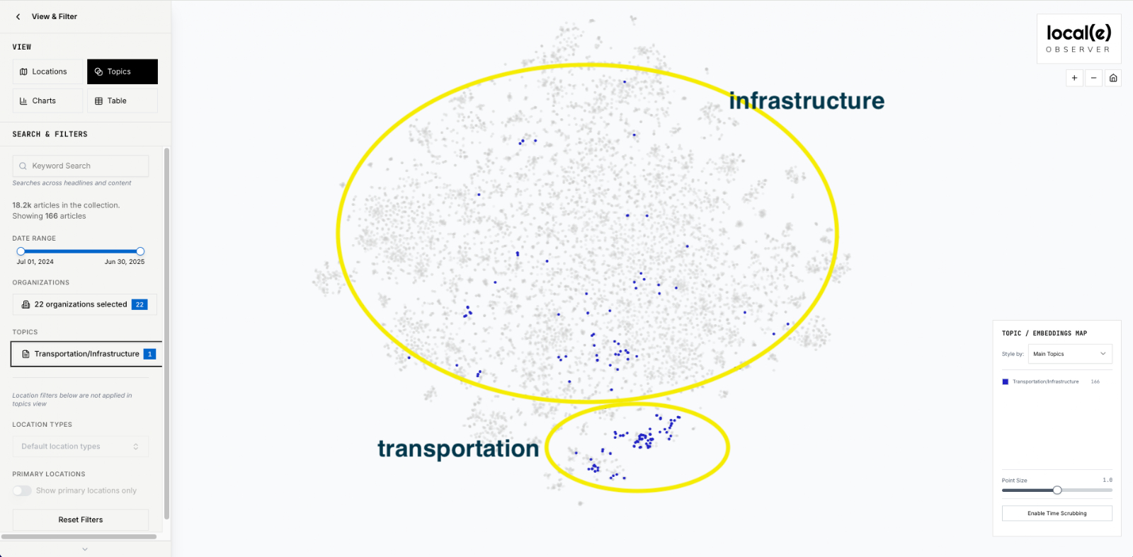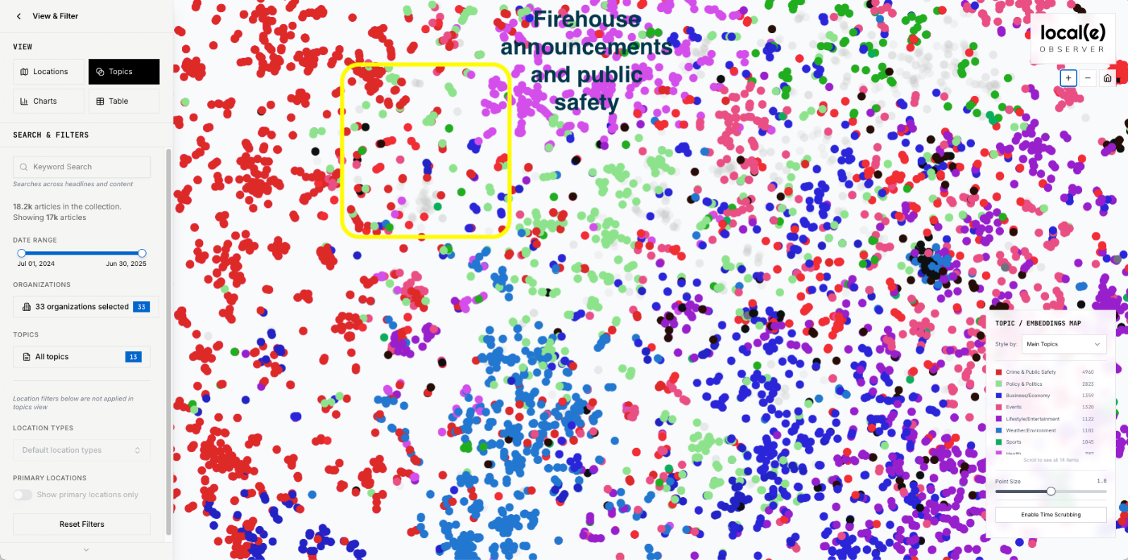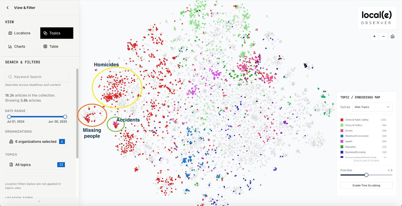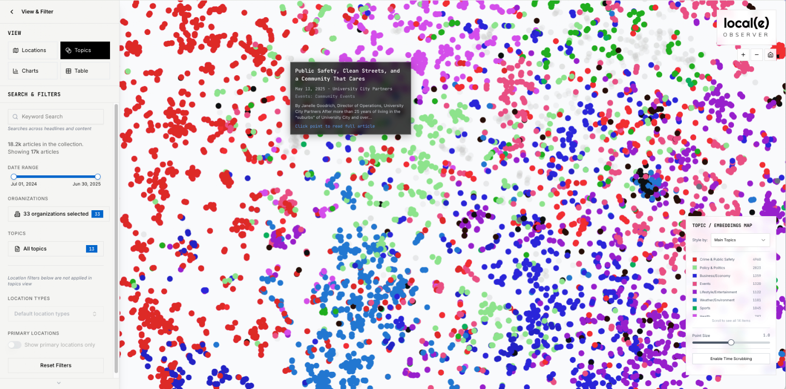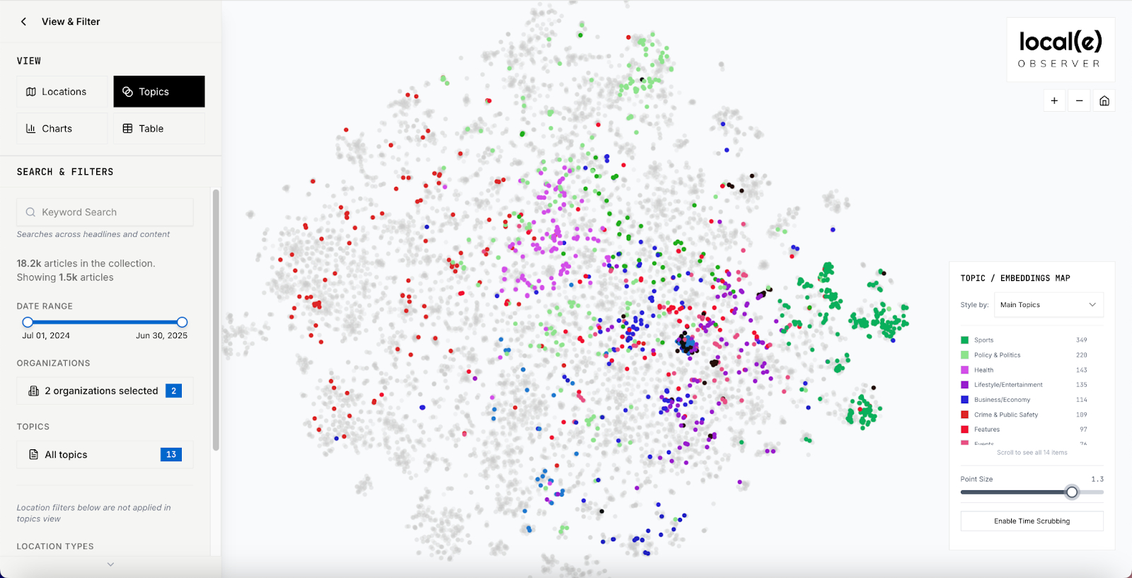 At the same time, the advent of artificial intelligence and advanced computational tools has allowed local news mapping to make giant leaps forward. Research can now go beyond the traditional local news outlet census to analyze content for both breadth of topics covered and detailed geographic coverage areas—down to the census-tract level.