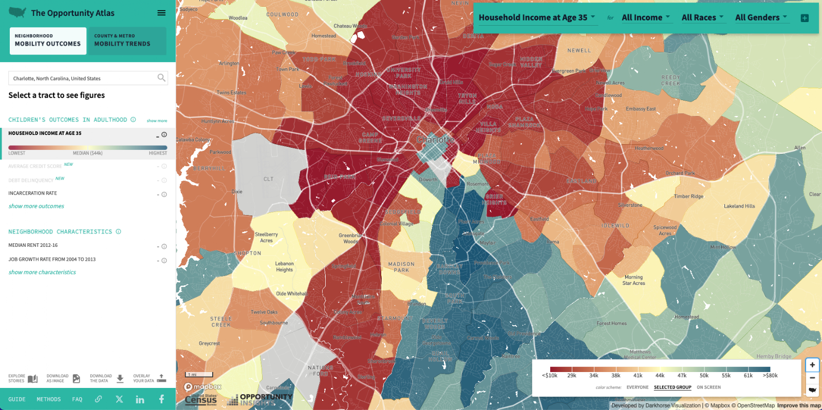Figure 1: Map of Charlotte that accompanies the Chetty report, showing household income by census tract, reflecting the “wedge and crescent” pattern.