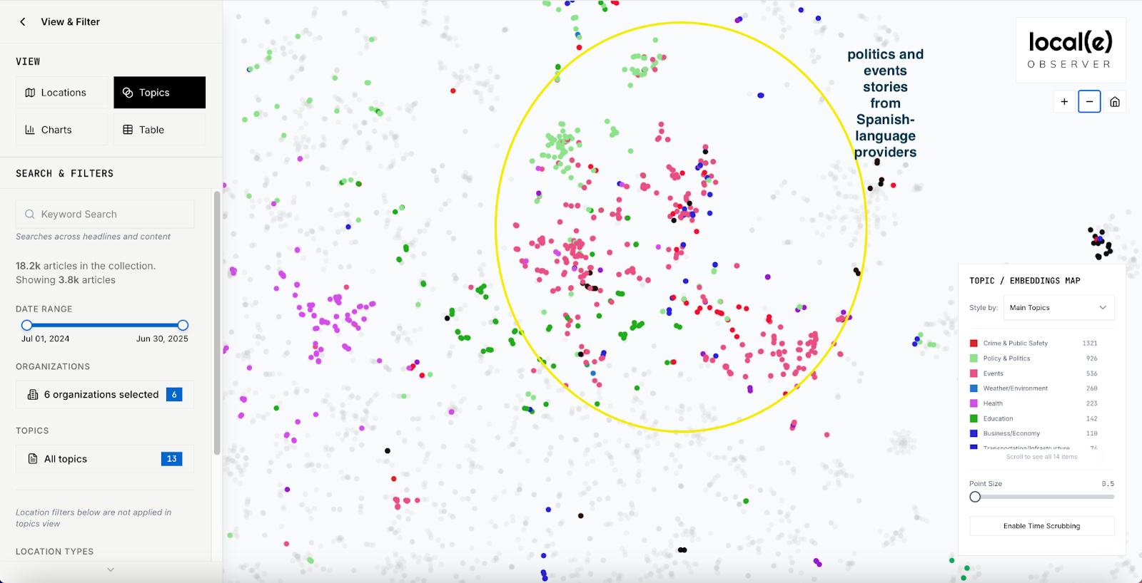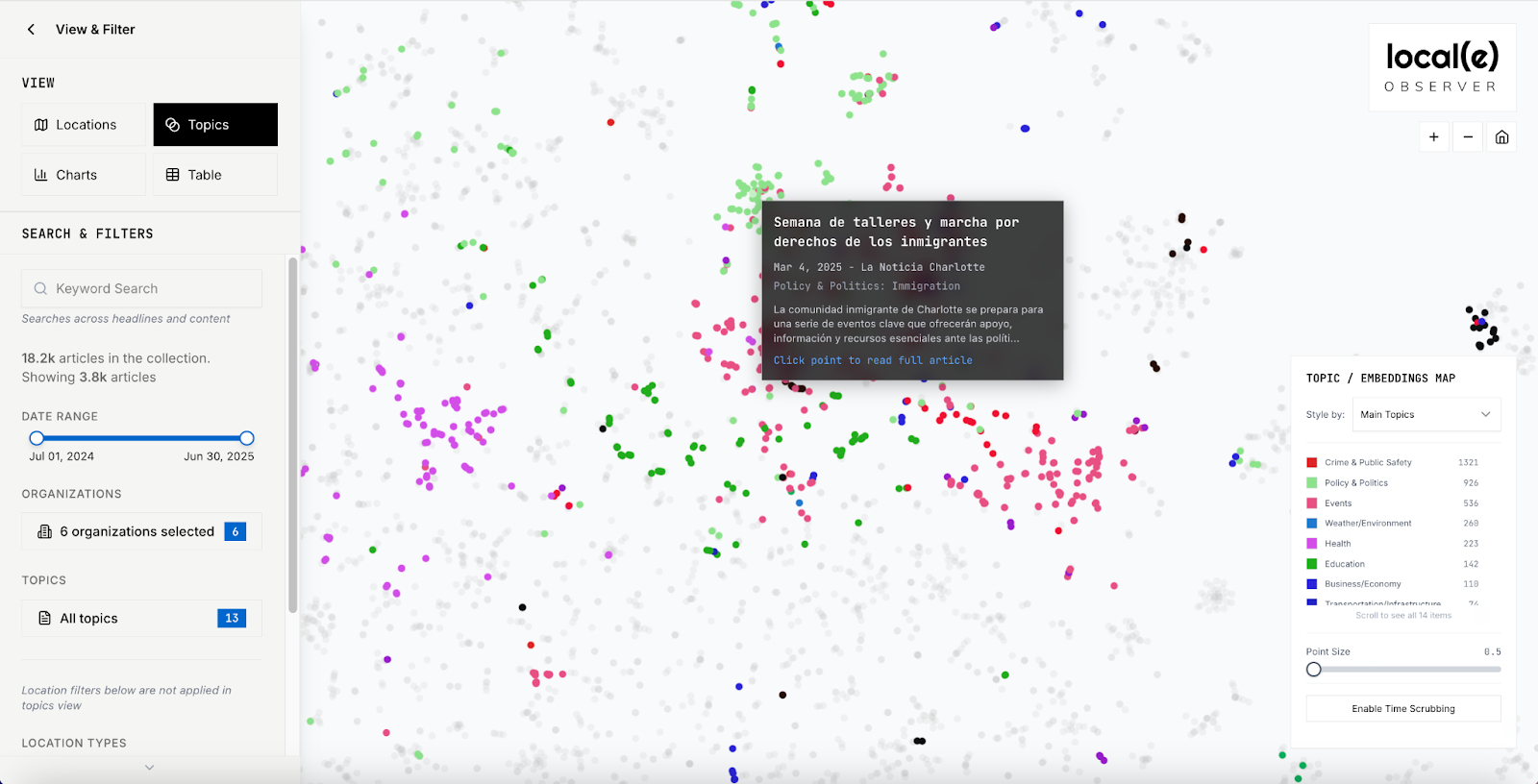 Many of the policy and politics stories by Spanish-language local news providers during our sample period—well before the immigrant roundups in Charlotte in November of 2025—were about immigration and immigrants’ rights.30[30] See also S. Stonbely, “Covering the Raids,” Columbia Journalism Review, Dec. 4, 2025, cjr.org/tow_center/immigration-enforcement-operations-in-north-carolina-highlight-the-importance-of-local-news.php The story highlighted in Figure 10 is about a series of marches and workshops about and for immigrants that occurred over a week in March of 2025. Figure 11 shows that very few other providers were writing about these topics at the time, as evidenced by the lack of gray dots in the area. Likewise, many of the event stories from Spanish-language outlets (the dark-pink dots) were about immigrants and immigration, which is why they cluster near the policy and politics stories (the light-green dots).